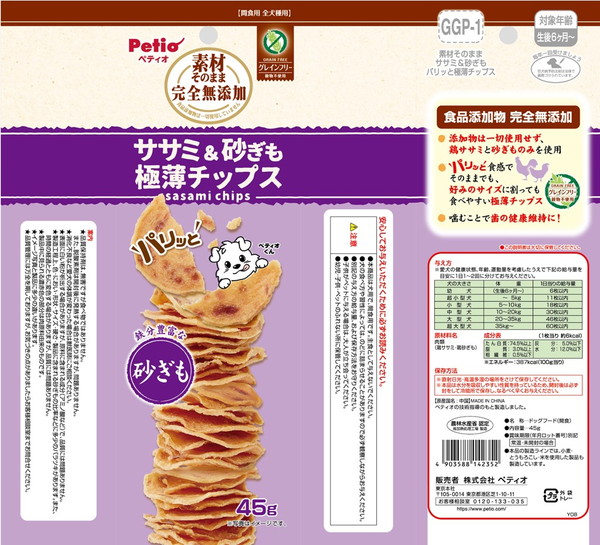 ペティオ 素材そのまま 完全無添加 ササミ&砂ぎも パリッと 極薄チップス 45g