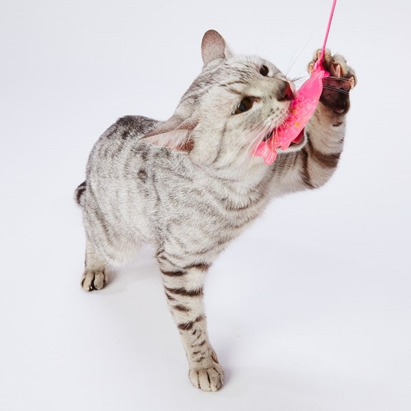 先端が赤ちゃんの玩具でも使われている柔らかい樹脂製で、ウロコは爪や歯がかかりやすい形状になっています。持ち手が短いため扱いやすく、仔猫でも見つけやすいビビットな色使いです。仔猫の初めての玩具にピッタリです。