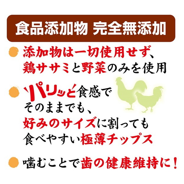 食品添加物完全無添加、鶏ササミと緑黄色野菜のみを使用しました。パリッと食感でそのままでも、好みのサイズに割っても食べやすい極薄チップス。