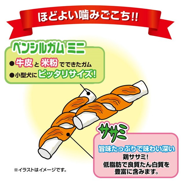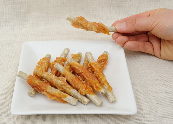 ・牛皮と米粉で出来たペンシルガムを低脂肪な鶏ササミで巻きました!ほどよい噛みごたえがくせになる!