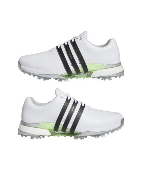 ZGとコードカオスのキーテクノロジーを融合し、最高レベルのトータルパフォーマンスを追求した、キング・オブ・ツアー パフォーマンス。\n■ [アッパー]履くほど足に馴染み、ハイグレードな天然皮革素材を採用。上質な質感でありながら、世界のトップブランドLWGの認証を受けた最高レベルのサステナ基準をクリアした素材を採用。適所に通気口を採用し天然皮革に優れた通気性をもたらす。\n■[ミッドソール]2つの高性能クッショニング素材をハイブリッドし、いずれもツアー360初搭載。前足部はZGに採用されている超軽量で高反発なLIGHTSTRIKEによってシリーズ史上最も蹴れる性能を実現し、前作のツアー360 22比較で約10gもの軽量化に成功。ヒール周りには、ゴルフ初搭載のJETBOOSTを採用し、BOOST本来のソフトな感触は継承しつつ、BOOST粒子をより細かくし潰れすぎを抑えることでスイング時の安定性を向上。