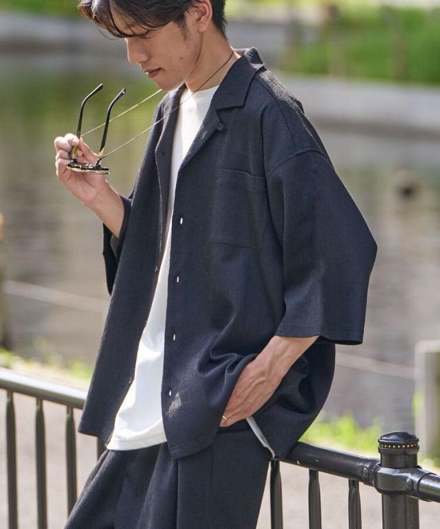 *暑い日に嬉しい機能性素材シャツ。触れるとひんやり涼しい接触冷感素材で仕立てたオープンカラーシャツ。