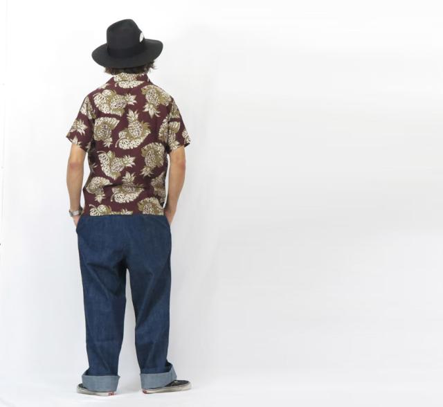 (生地を染色した後に柄部を脱色し着色、その後蒸して発色させる昔ならではの製造工程)を経てカタチにした本物のアロハシャツです。