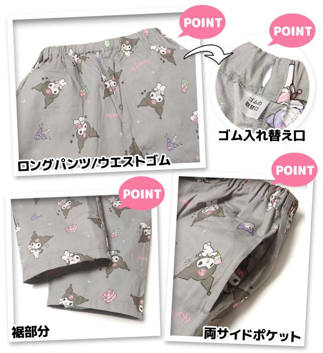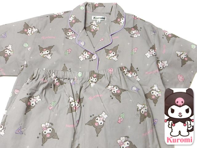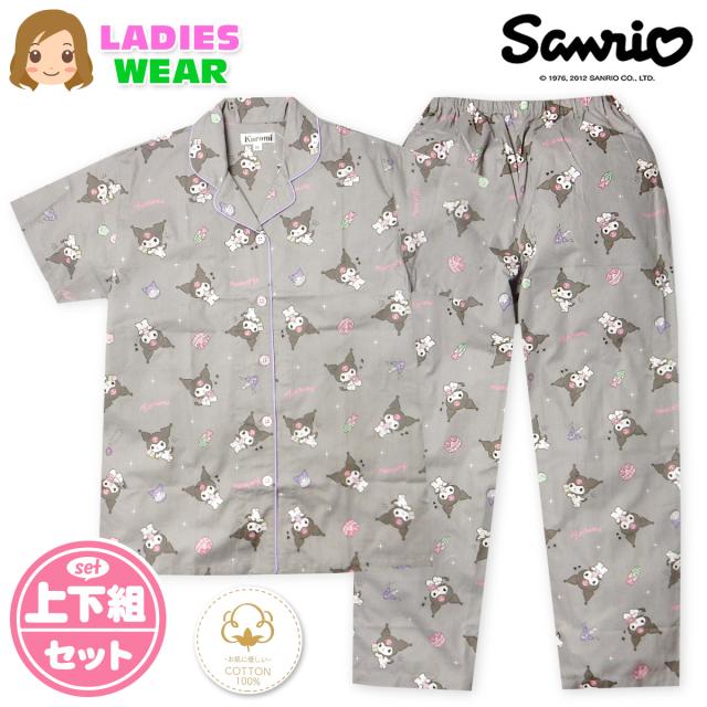【送料無料】婦人 レディース 綿100% 半袖 パジャマ 前開き 上下組 Sanrio サンリオ クロミ ロングパンツ シーチング 総柄 M L yg-2885d-gy【メール便対応】