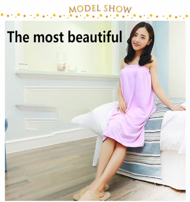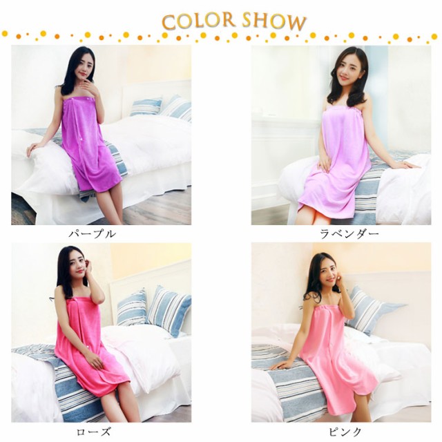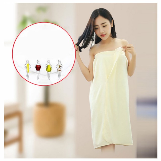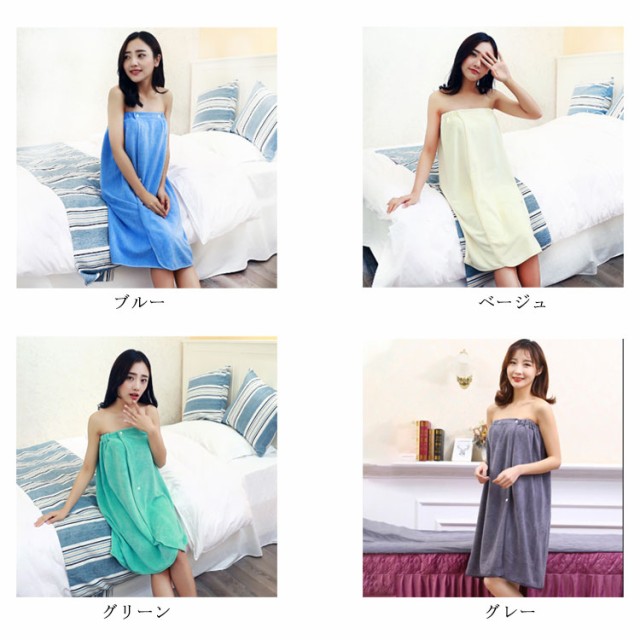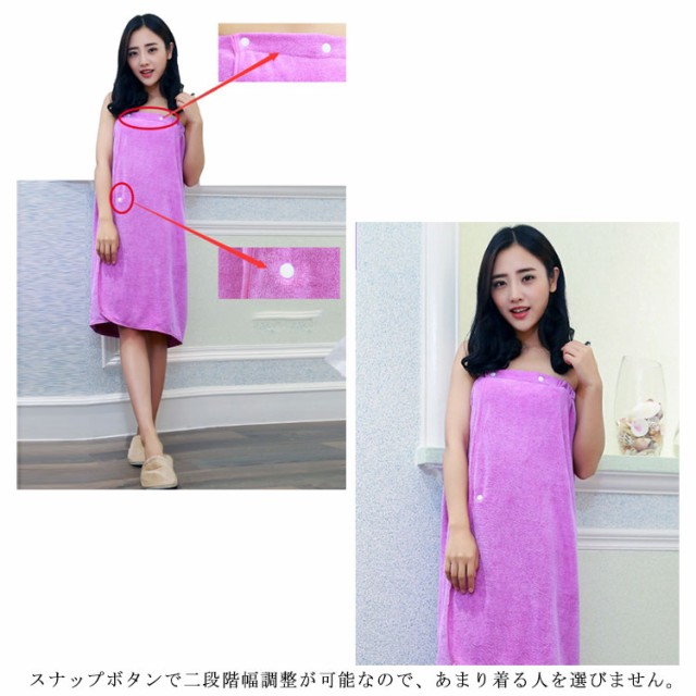 | さっと巻くだけでずり落ちないバスタオル。 ふわふわやわらかな手触りで身体をすっぽり包んですばやくしっかり吸水してくれます。 髪を乾かす時、ネイルケアやボディケアの時ゆっくりと時間を作れます。 ゴム入りでズレ落ちの心配やキツイ締め付け感がなく快適。 スナップボタンで二段階幅調整が可能なので、あまり着る人を選びません。 お風呂上がりに手軽に着られ、お子様をすぐにケアできるので、とっても重宝されています。 | |
