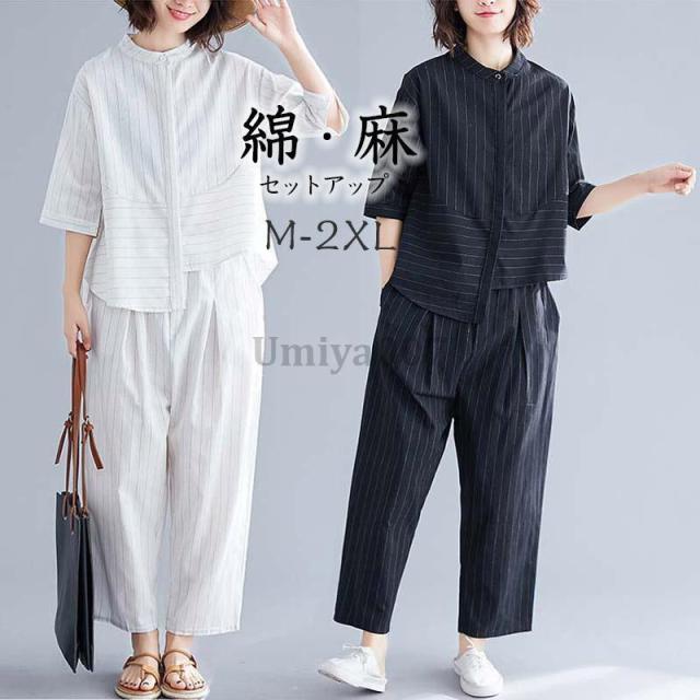 パンツスーツ レディース セットアップ 夏 おしゃれ カジュアル 上下セット Tシャツ 半袖 綿麻 大きいサイズ 韓国風 着痩せ 通勤 OL