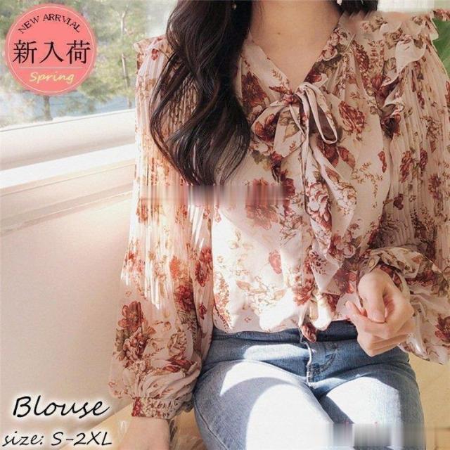 連携キーワード:ブラウス レディース 長袖ブラウス 春夏新作 オフィスブラウス 花柄リボンフレア オシャレブラウス シフォントップス 韓国風 大人 上品 通勤OL ゆったりシャツ 大きいサイズ 40代 30代 50代