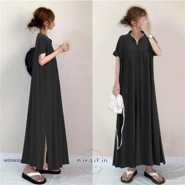 ワンピース40代 半袖 レディース 夏物 30代40代50代 ロングワンピース マキシ丈 aラインワンピース サイドスリット 黒ワンピース 薄手 シャツワンピース