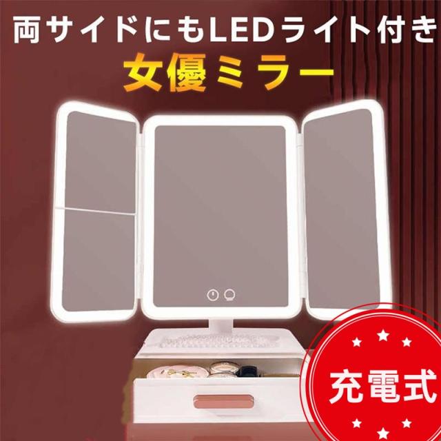 女優ミラー 両サイドにもLEDライト付き 卓上ミラー鏡 全面ライト 三面LED 化粧鏡 三面鏡 充電式 明るさ調節 マグネトロンスイッチ