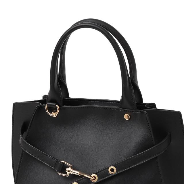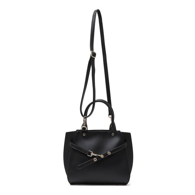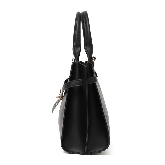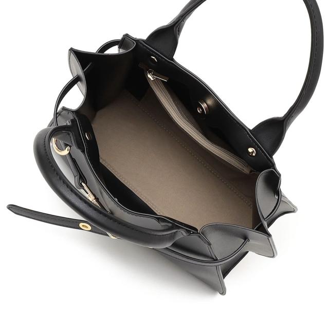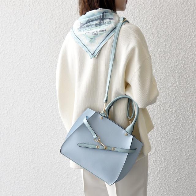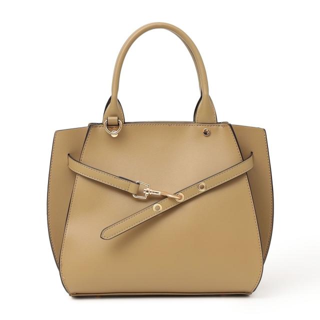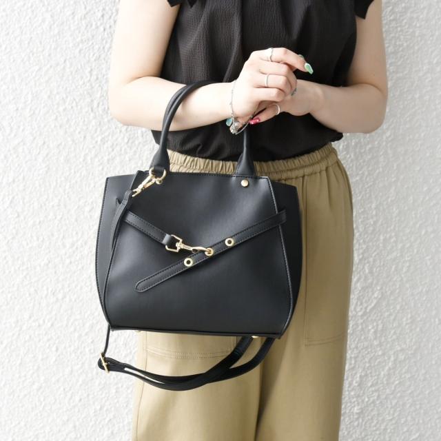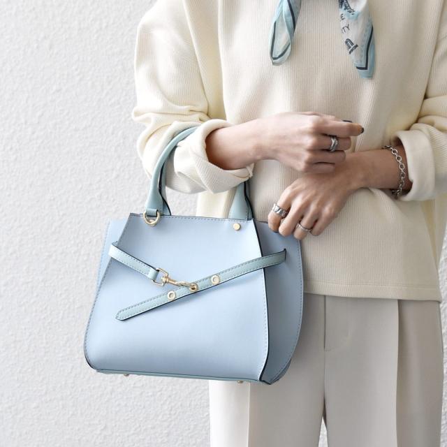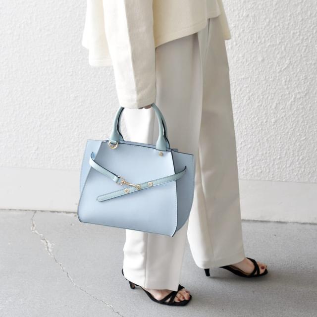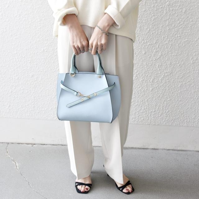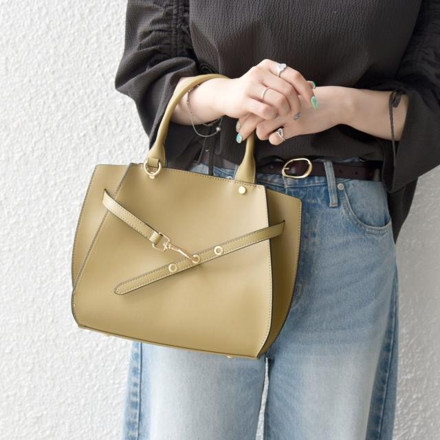 フロントの華奢なベルトが上品さを引き立てるハンドバッグ。