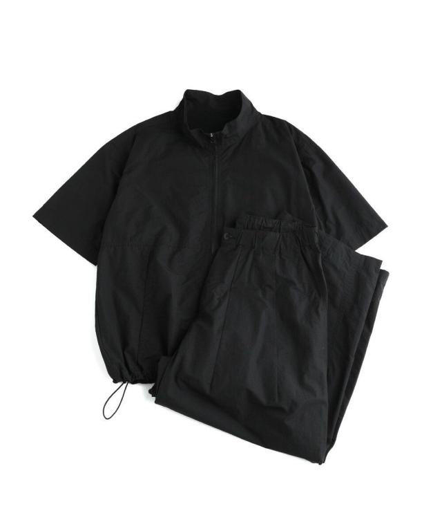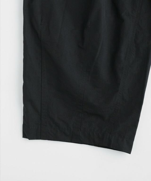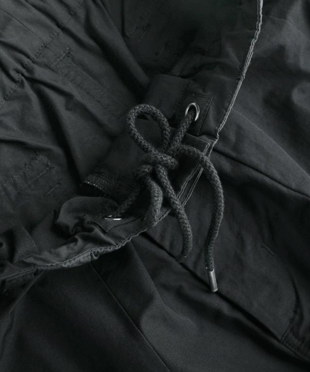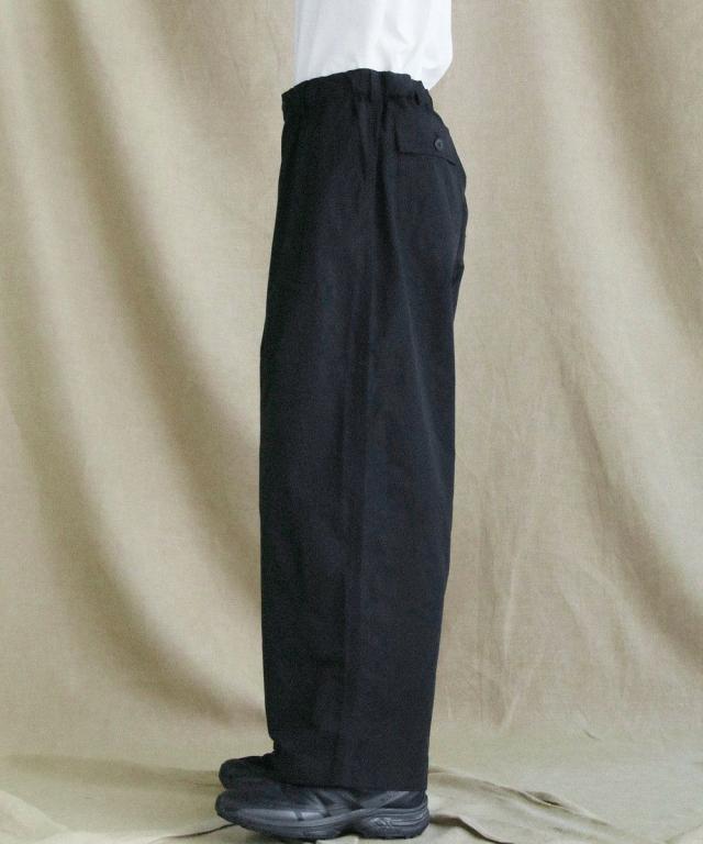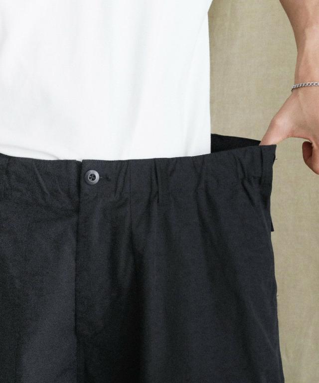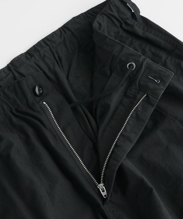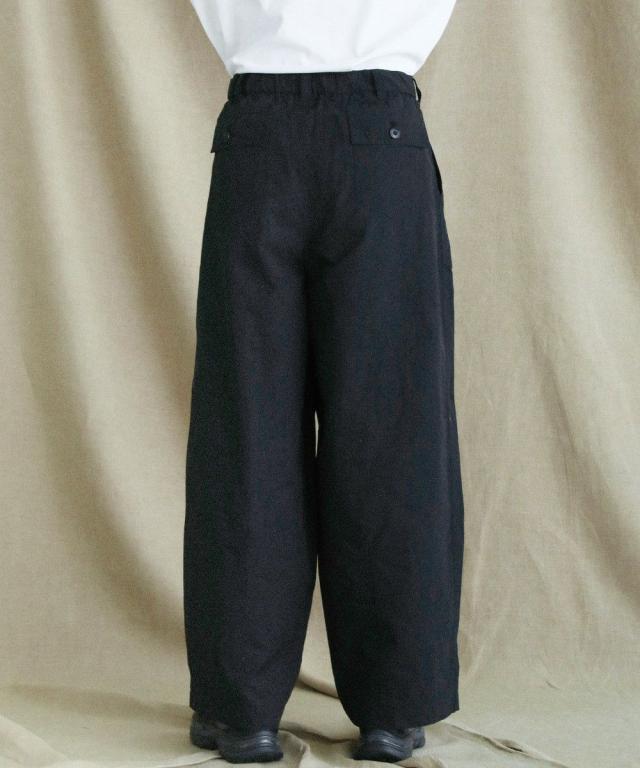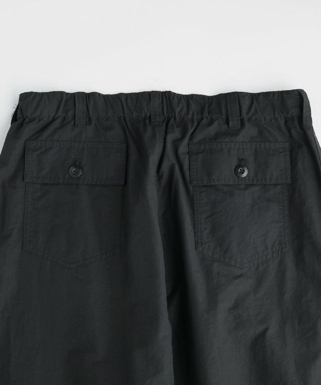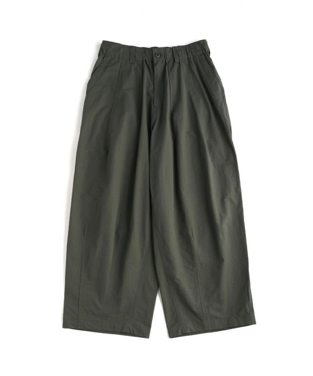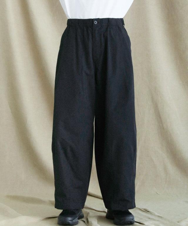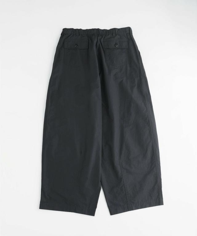 US ARMY のファティーグパンツから着想を得てコットンナイロン生地で仕立てたワイドパンツです。独特のパターンと前身頃裾2ヶ所・後身頃1ヶ所にダーツを取ることで作り出された、丸みのある立体的なシルエットが最大の魅力です。腿から裾にかけて大きく膨らみをつけたバルーン型ですが膝下からのテーパードのおかげで、だぼつくことなくスッキリと穿いていただけるワイドパンツとなっております。深い股上に、ゴムと紐を通したイージー仕様のウエストで窮屈感のない穿き心地に。気軽に普段使いしていただける穿きやすい一本です。