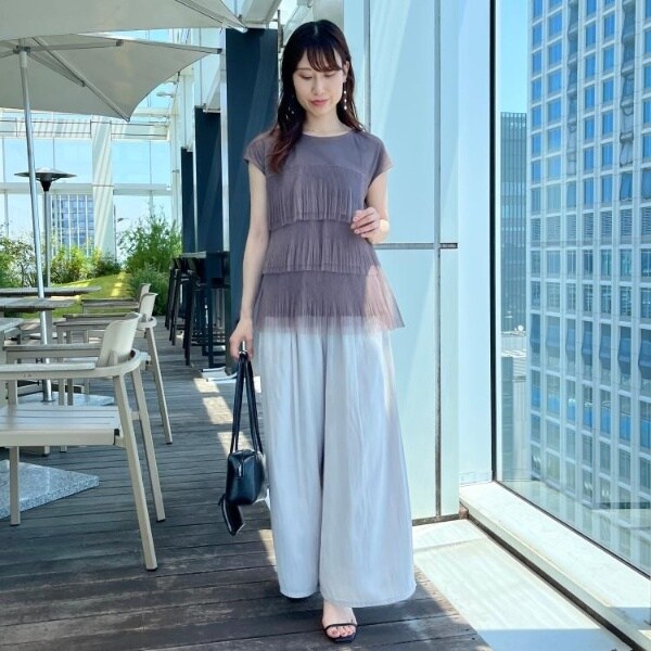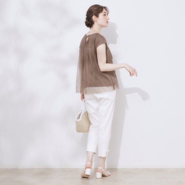・saori(153)チュール素材を大人可愛く仕上げた一枚です◎インしないでキマるチュニック丈なので、すっきりパンツとの相性◎ON・OFF問わず着用いただけます!