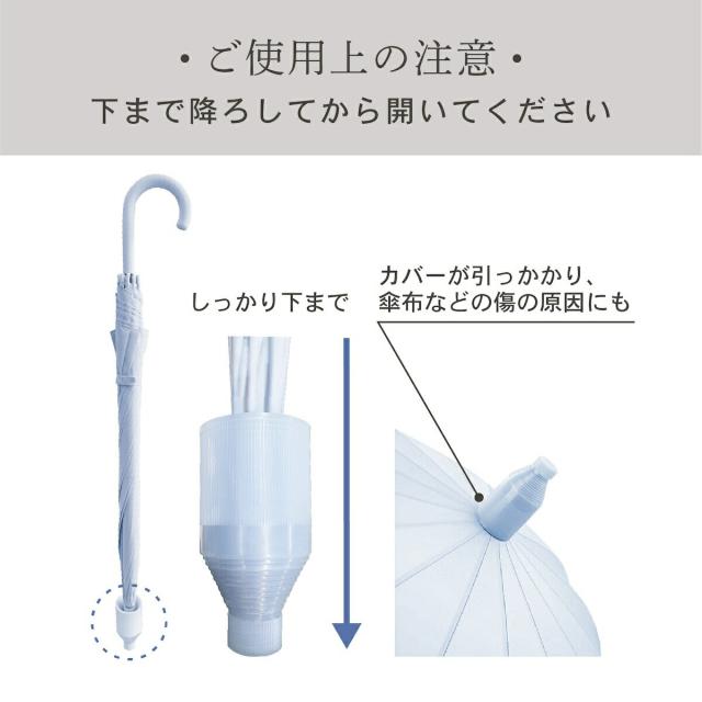 傘の先端に付いたスライドカバーをスライドするだけで濡れた面を覆ってくれるので、車内や通勤通学の際の混みあった電車内でも安心してお使いいただけます!