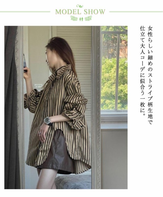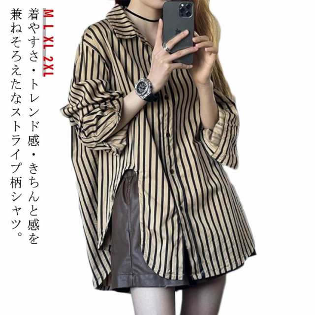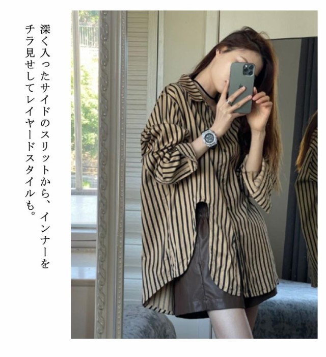 送料無料 チュニックシャツ ストライプ ロング シャツ ブラウス ストライプシャツ 襟付き スキッパー オーバーサイズ 長袖 ゆったり ロング ブラウス 羽織 着まわし 体型カバー カジュアル フェミニン 大人 春 夏 秋