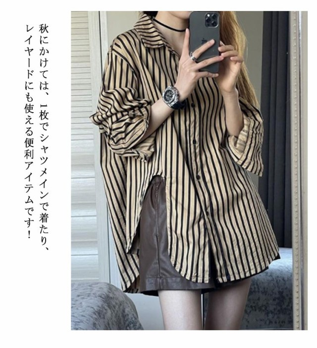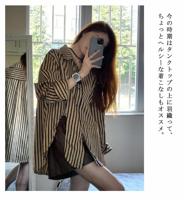 | 着やすさ・トレンド感・きちんと感を兼ねそろえたなストライプ柄シャツ。 女性らしい細めのストライプ柄生地で仕立て大人コーデに似合う一枚に。 深く入ったサイドのスリットから、インナーをチラ見せしてレイヤードスタイルも。 メイン使いではもちろん、羽織りとして、またニットのインに重ねてレイヤードスタイルにも活躍し、ワードローブに欠かせないアイテム。 ゆったりシルエットなので、スキニーと合わせてメリハリのあるスタイルに。足元はスニーカーで思いっきりカジュアルなコーデもオススメ。 今の時期はタンクトップの上に羽織って、ちょっとヘルシーな着こなしもオススメ。 秋にかけては、1枚でシャツメインで着たり、レイヤードにも使える便利アイテムです! | |