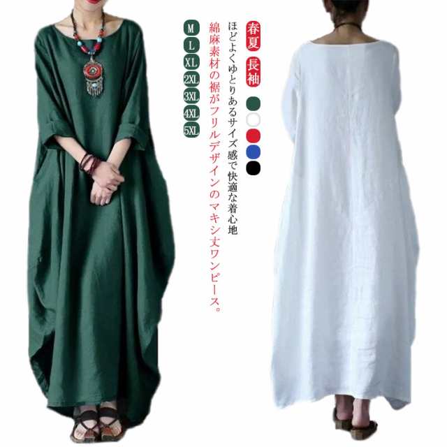 送料無料 綿麻ワンピース レディース リネンワンピース ロングワンピース バルーンワンピ マキシ丈 バルーンシルエット マタニティー ゆったり 体型カバー オーバーサイズ エスニック風 無地 春 秋 長袖 着痩せ カジュアル ナチュラル