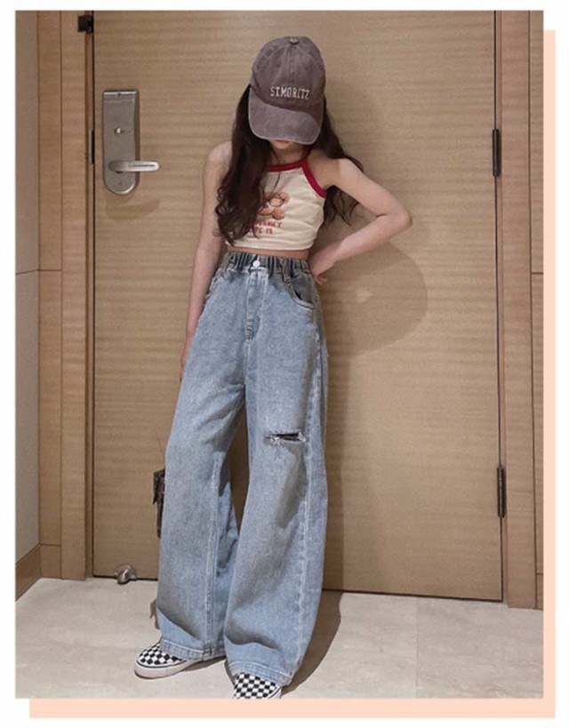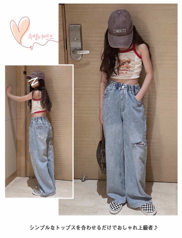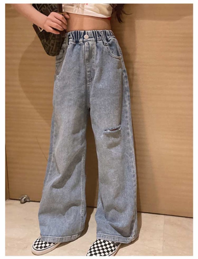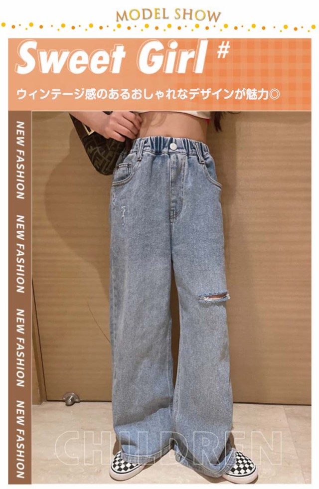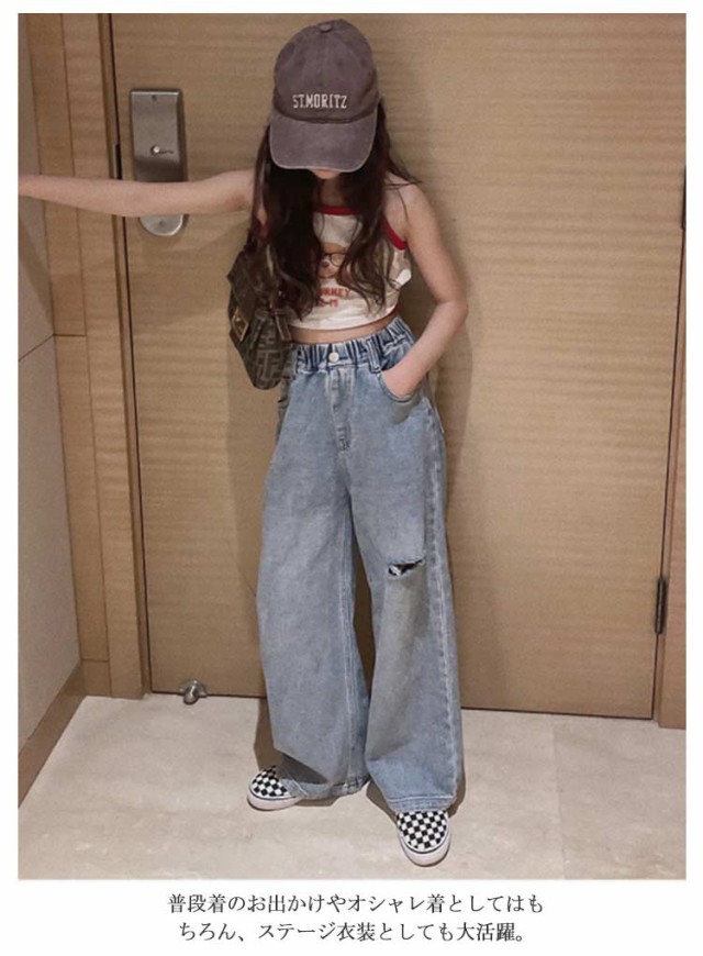 キッズ デニム パンツ ワイドパンツ ジーパン 女の子 ウェストゴム ダメージ加工 ロングパンツ 小学生 春服 送料無料 130 140 150 160 170 ダンス衣装 長ズボン ジーンズ こども おしゃれ
