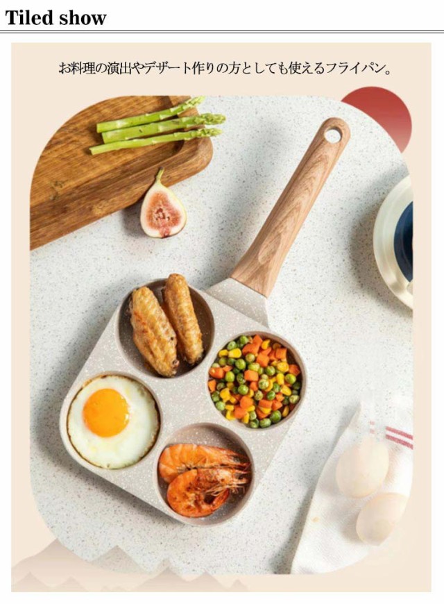 | IH対応。(※ガス火でもお使いいただけます。) お料理の演出やデザート作りの方としても使えるフライパン。 忙しい朝もこのフライパンを使えば、1度に卵焼きやウィンナー、ハンバーグ、ソーセージなどの4つの食材を同時に調理することができます。オムレツやホットケーキなどいつもの料理もかわいく演出できます。 プリンなゼリーなどのデザート作りの型としてもご使用いただけます。 均一に熱伝導鍋体は均一に熱を受けてかまどを選ばない、熱伝導が速くて均一で、各種のガスレンジ及び電磁炉に適します。 表面はフッ素樹脂加工を施してありますので、使用後のお手入れもラクラク。 べたべたせず、手間を省き、手をいたわる。 持ち手が掛けられる設計で、場所を取らず、省スペースで便利。 鍋底を深くする設計で大容量になり、目玉焼きもこぼれにくい。 軽量化設計、重さは約0.57kgで片手でコントロールできる。 | |