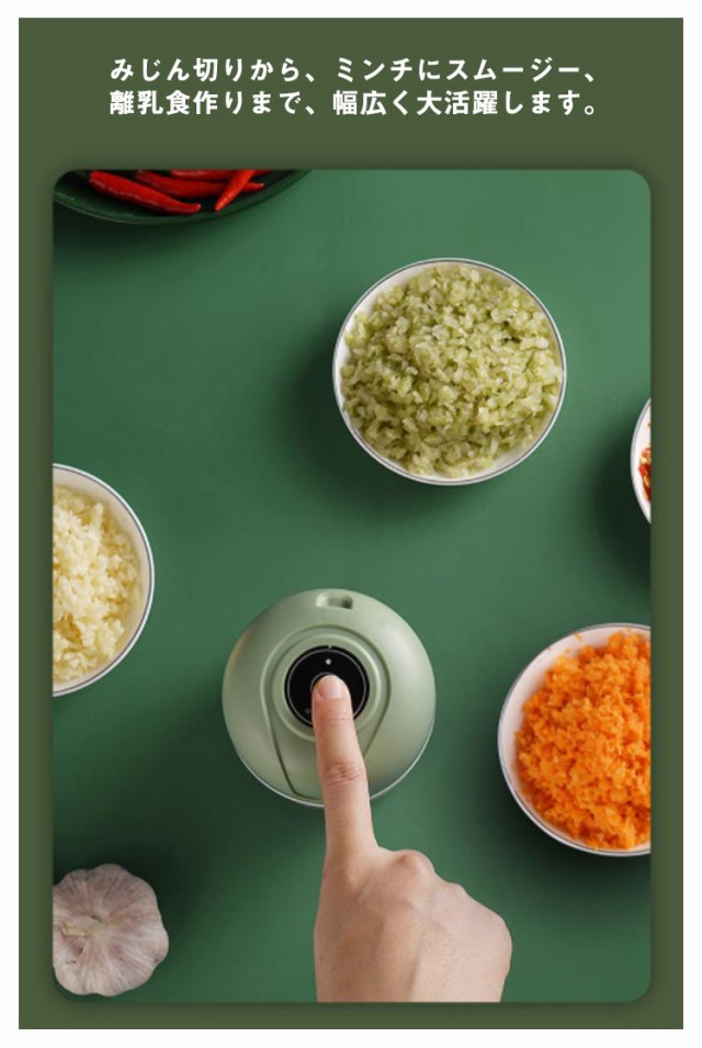 | ボタンを押すだけ、わずか10秒であっという間にみじん切り完了! 野菜のみじん切り、肉や魚のミンチなどにぴったり。 コンパクトサイズなので収納場所も取りません。 本体以外は全て水洗いできてお手入れも簡単です。 みじん切りから、ミンチにスムージー、離乳食作りまで、幅広く大活躍します。 ステンレス鋼の刃は頑丈で耐久性があり、効率的に切断できます。 使用終了後すぐにアクセサリーとボウルを洗ってください。 | |