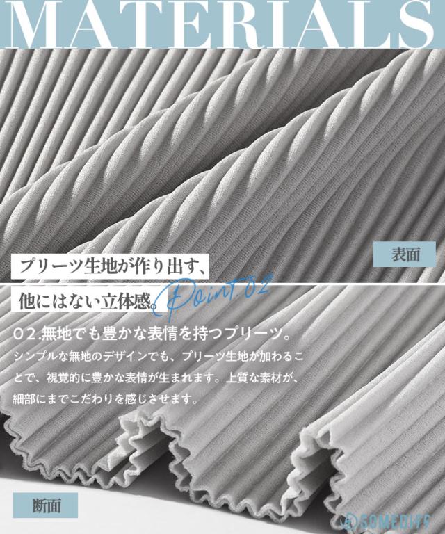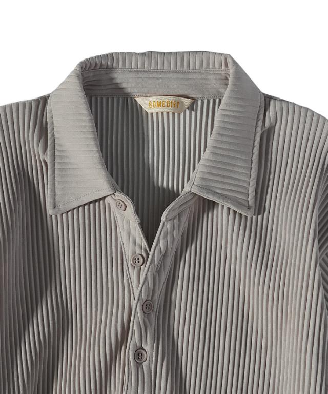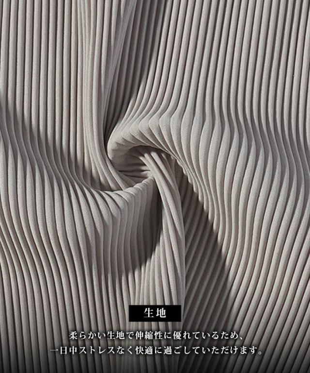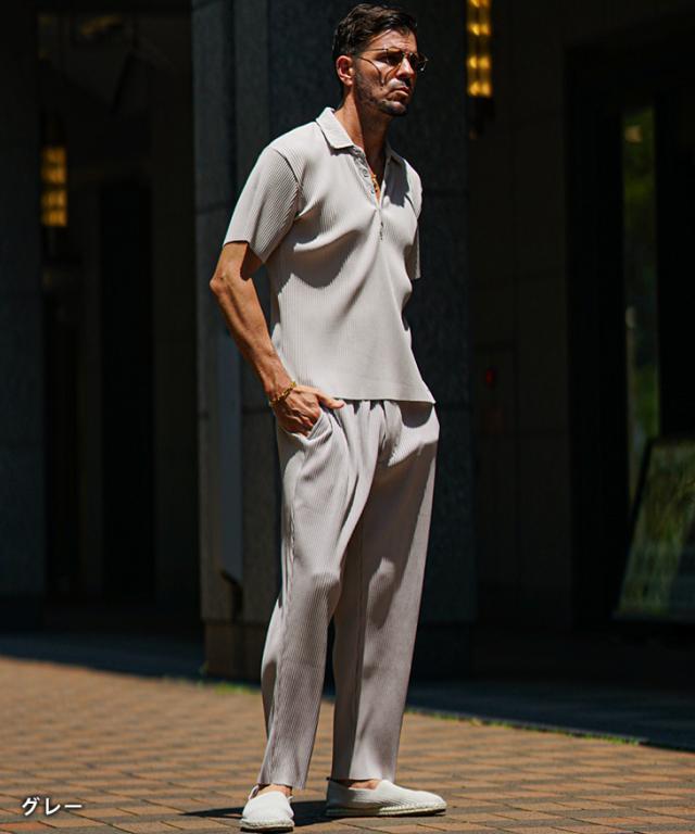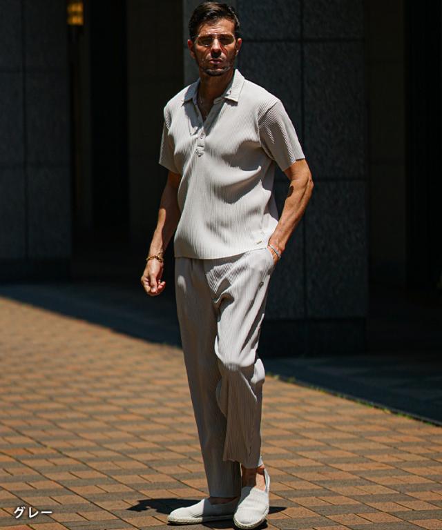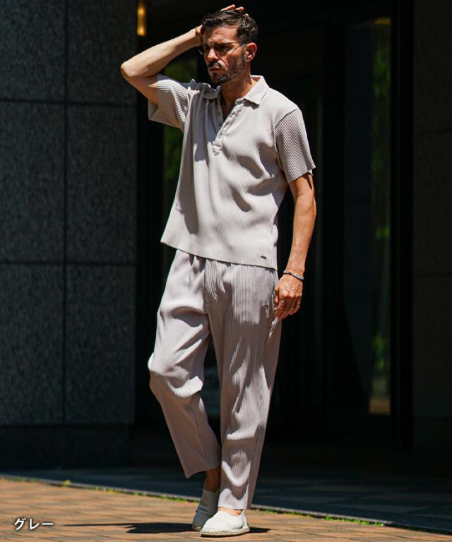 SOMEDIFF(サムディフ)『プリーツポロセットアップ』【プリーツポロセットアップ】■Design/デザイン上品さとリラックス感を兼ね備えた、プリーツポロシャツ&プリーツロングパンツのセットアップ。しっとりと肌になじむ落ち感のある生地は、シワになりにくくお手入れも簡単です。ポロシャツにはボタンが4つ付いていますが、スキッパーシルエットなので、ボタンを留めずに着るか、一番下のみ留めるのが着こなしのポイント。胸元の美しいラインで色気を演出します。ロングパンツは、縦に流れるプリーツが脚をすっきり見せ、動くたびに揺れるシルエットが上品さをプラス。リラックス感のあるはき心地で、日常にも旅先にも寄り添ってくれる一本です。