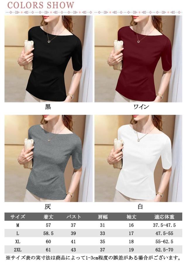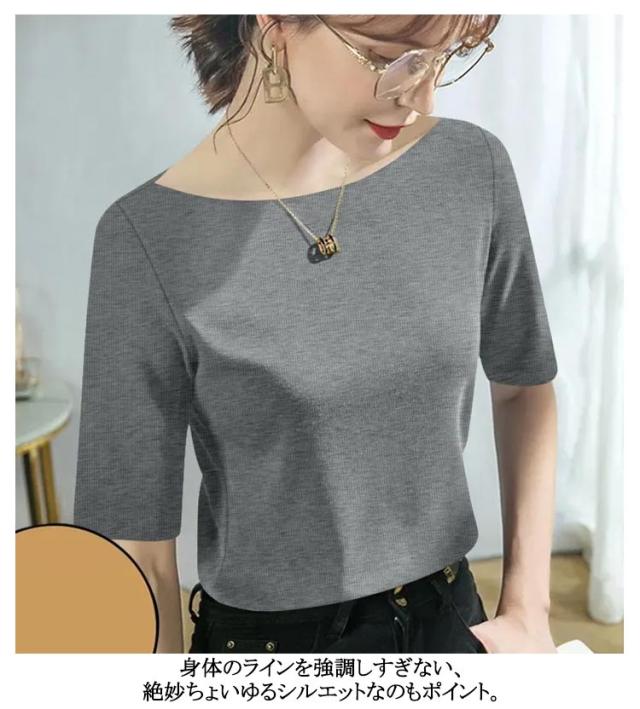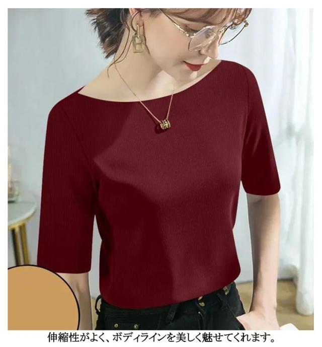 送料無料 tシャツ アイスシルクセーター レディース トップス 無地 ボートネック アイスシルク リブ編み 大人 五分袖 半袖 tシャツ ショート丈 着やせ トップス プルオーバー 接触冷感 涼しい