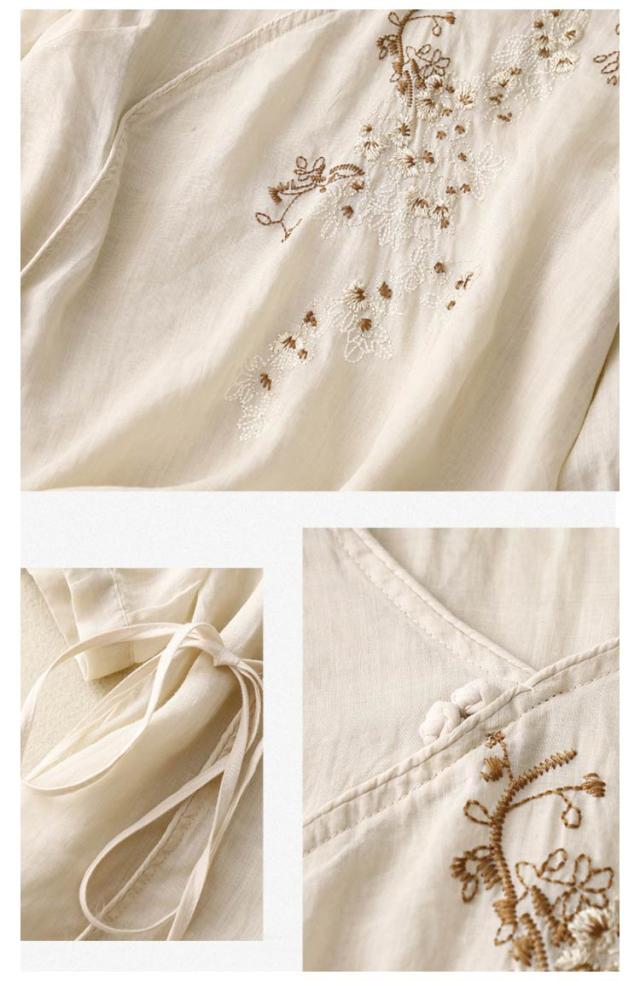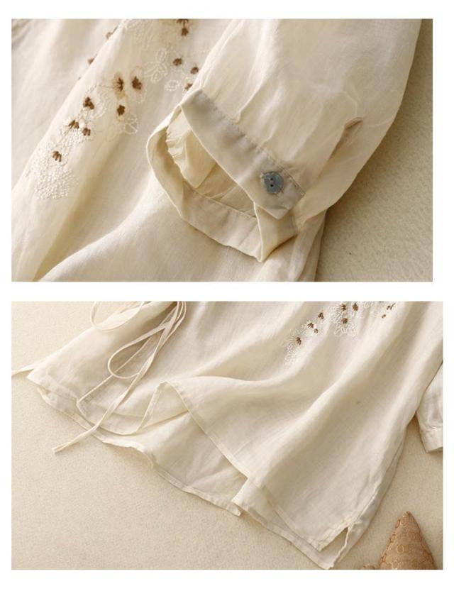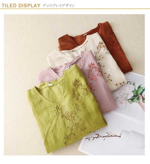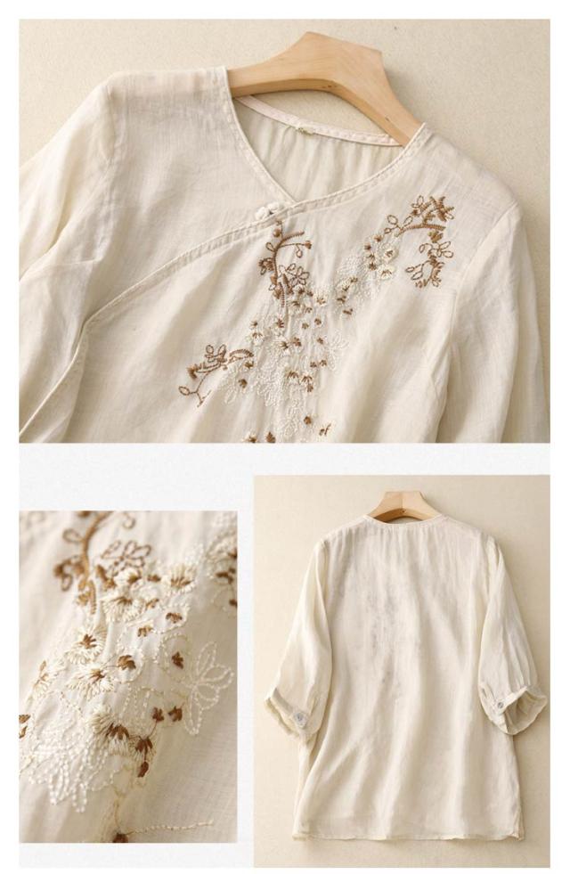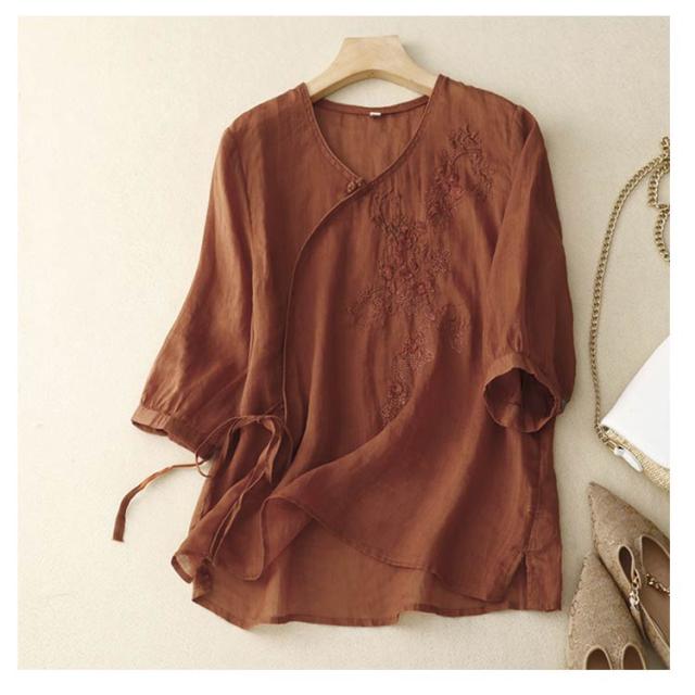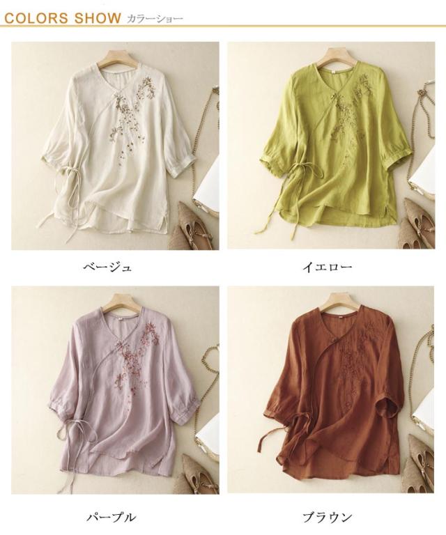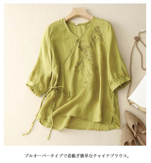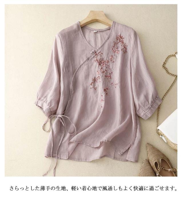 ブラウス 中華風 チャイナブラウス 7分袖 薄手 夏 tシャツ Vネック シャツ ブラウス 綿麻調 花柄 刺繍 チャイナシャツ 綿麻調 アジアン 大きいサイズ ゆるシャツ 体型カバー