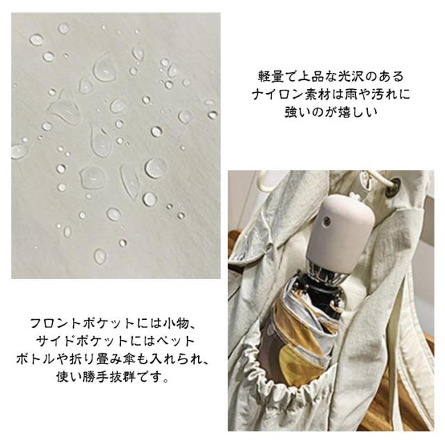 | A4サイズ対応で、肩掛けとしてもリュックとしてもお使いいただける2wayバッグ。 トートもリュックもできますので、気分により楽しく使えます。 軽量で上品な光沢のあるナイロン素材は雨や汚れに強いのが嬉しい A4やiPadや500mlペットボトル、ハンディファン、三つ折り財布、ハンカチ、ポーチなどが入る大容量サイズ! フロントポケットには小物、サイドポケットにはペットボトルや折り畳み傘も入れられ、使い勝手抜群です。 カチッとしたスタイルにもカジュアルスタイルにも対応できる多機能マルチバッグです! | |
