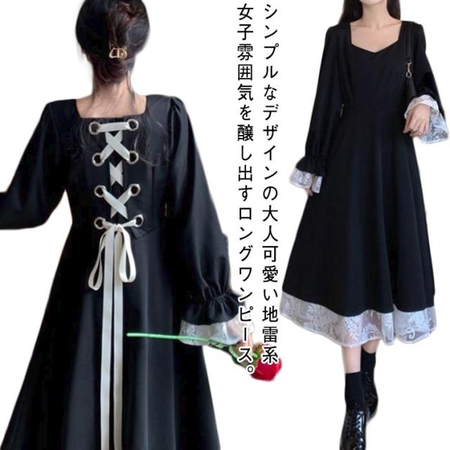 量産型 長袖 ワンピース ゴシック 服 量産型 レース レースアップ 天使界隈 地雷系 レディース Aラインワンピース バックコンシャス ハイウエスト ロングワンピース レース裾 可愛い 薄手 春 夏 秋 通気 サブカル系