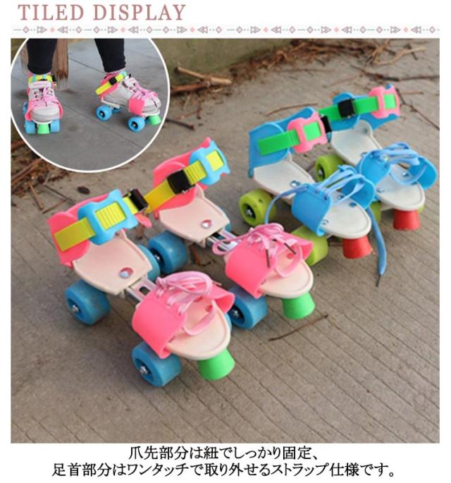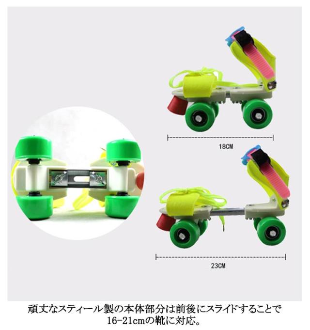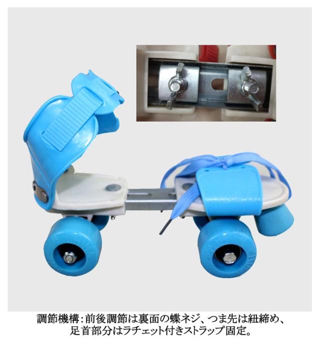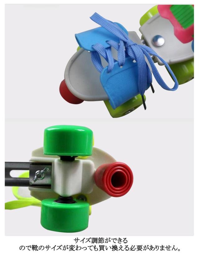 | 内寸16-21CM(長さ調節可能) 靴に直接取り付けられるローラースケート! 頑丈なスティール製の本体部分は前後にスライドすることで16-21cmの靴に対応。 爪先部分は紐でしっかり固定、足首部分はワンタッチで取り外せるストラップ仕様です。 サイズ調節ができるので靴のサイズが変わっても買い換える必要がありません。 調節機構:前後調節は裏面の蝶ネジ、つま先は紐締め、足首部分はラチェット付きストラップ固定 | |