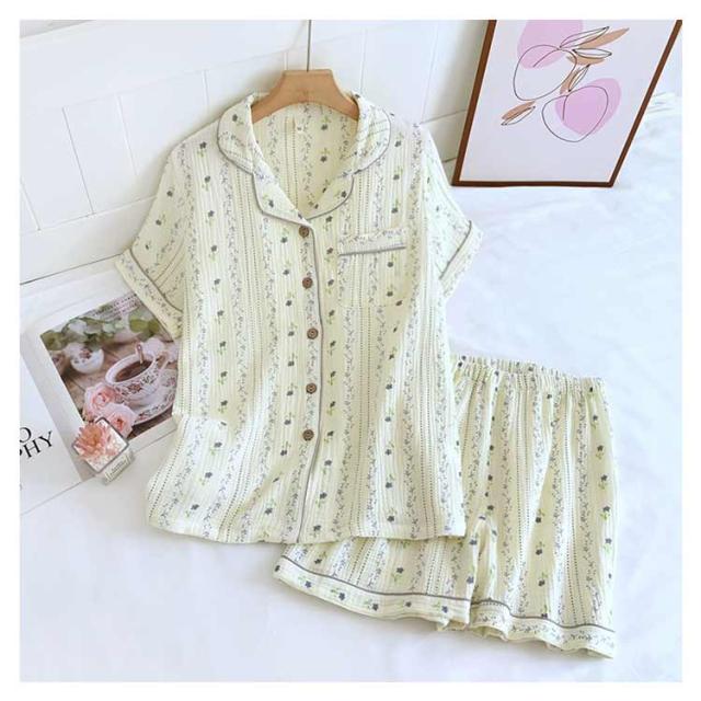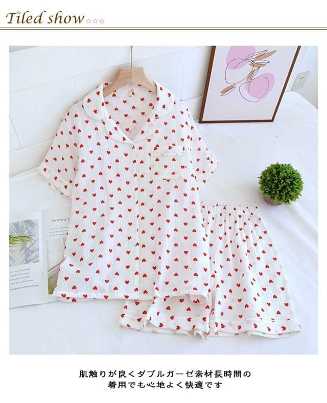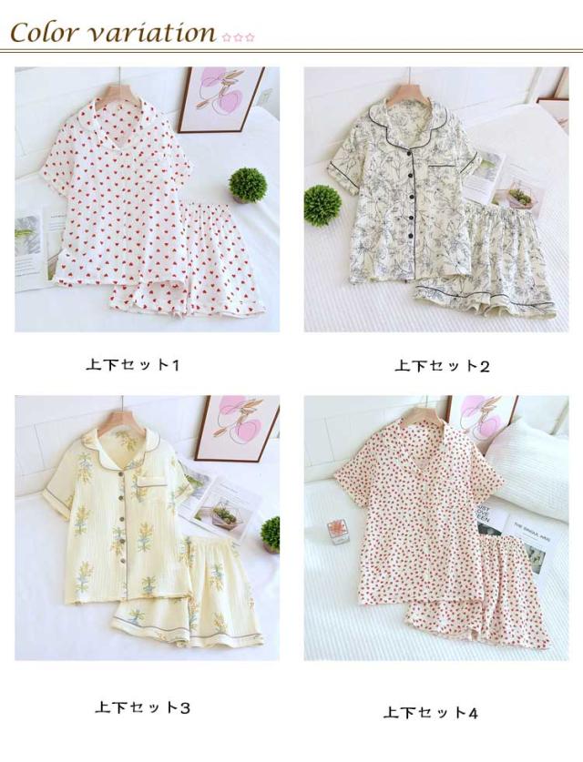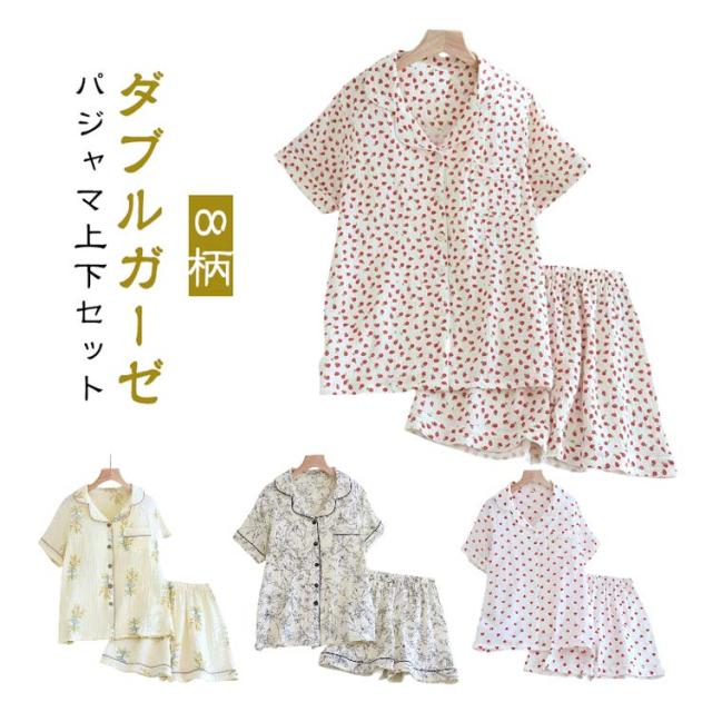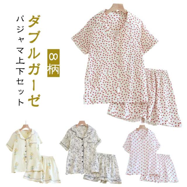総柄 上下セット 半袖 ナイトウェア パジャマ 夏 tシャツ セットアップ 綿 ダブルガーゼ レディース 二重ガーゼ 丈 ハーフパンツ ガーゼ トップス ショート ルームウェア パンツ ウエストゴム 大人 可愛い ふんわり 着心地