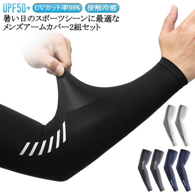 メンズ UPF50+ ロング 男用 2組セット 冷感アームカバー 接触冷感 2組セット 大きいサイズ スポーツ アームカバー 野球 アームカバー 自転車 ゴルフ 日焼け対策 アウトドア 紫外線対策 UVカット ズレ落ち防止 滑り止め 軽量