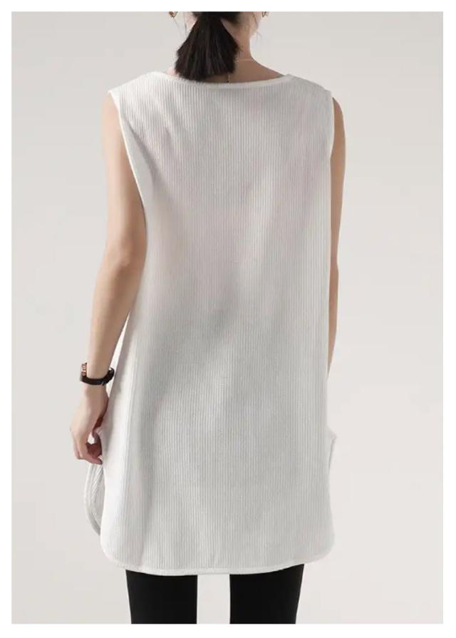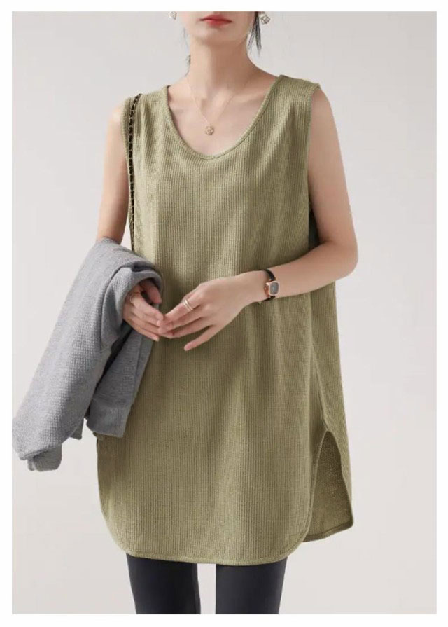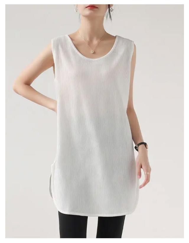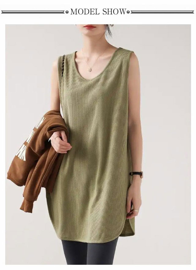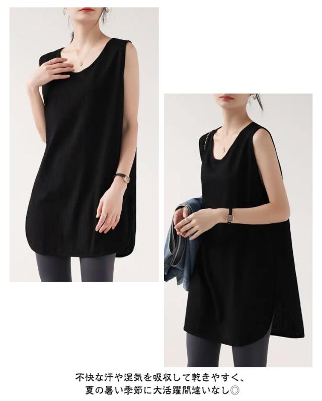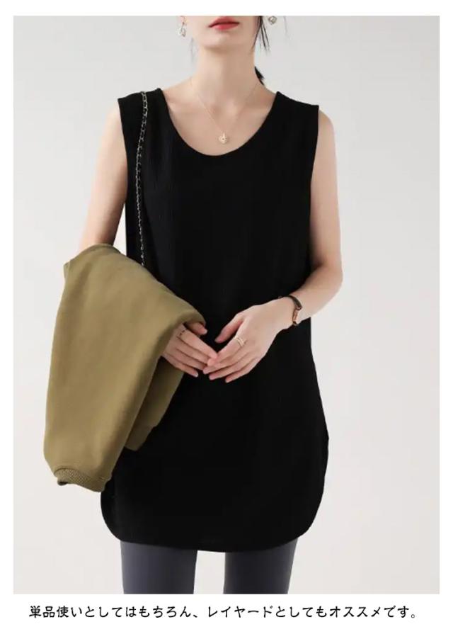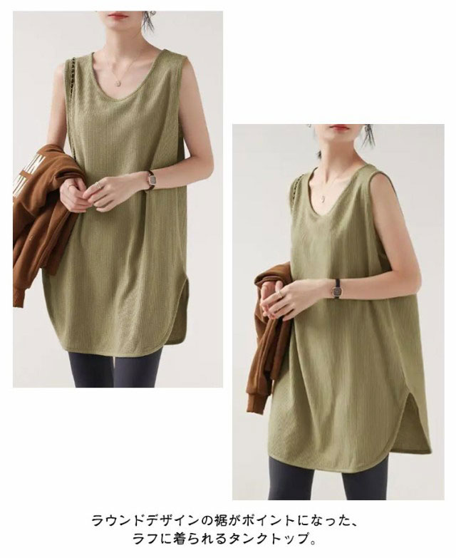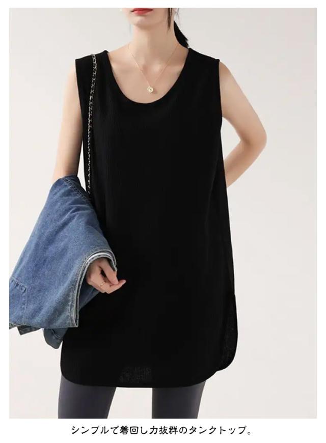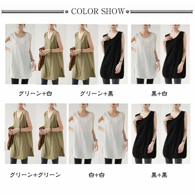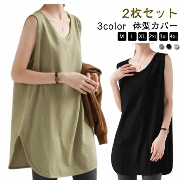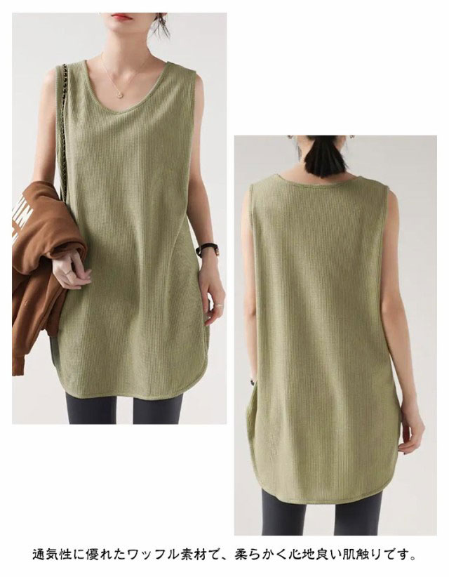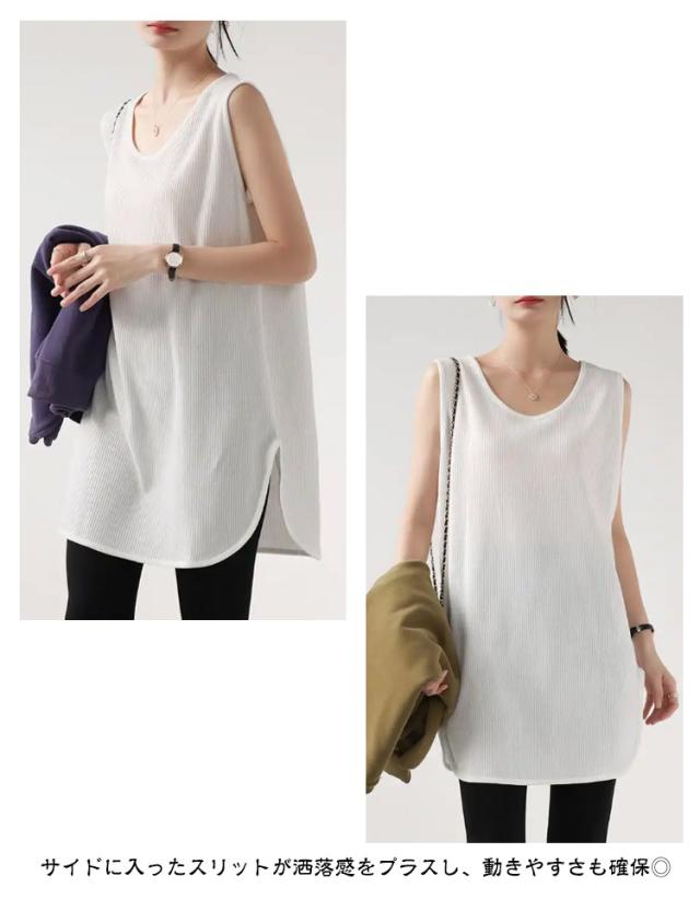 2枚セット!タンクトップ レディース トップス ノースリーブ Uネック ゆったり インナー タンクロング タンク レイヤード 体型カバー スリット ロング丈 透けにくい ラウンド裾 無地 ワッフル生地 チュニック 大きいサイズ 白 黒 シンプル