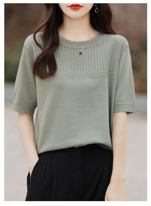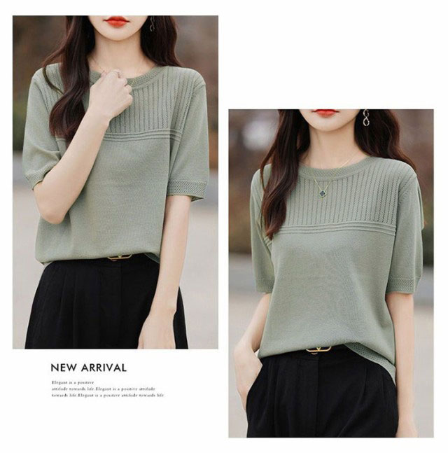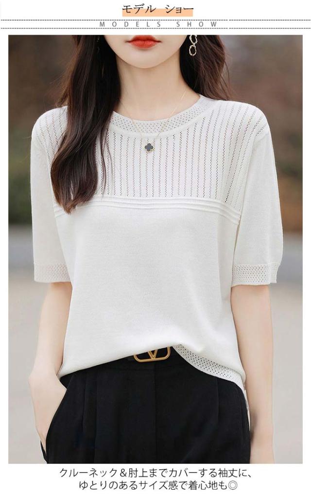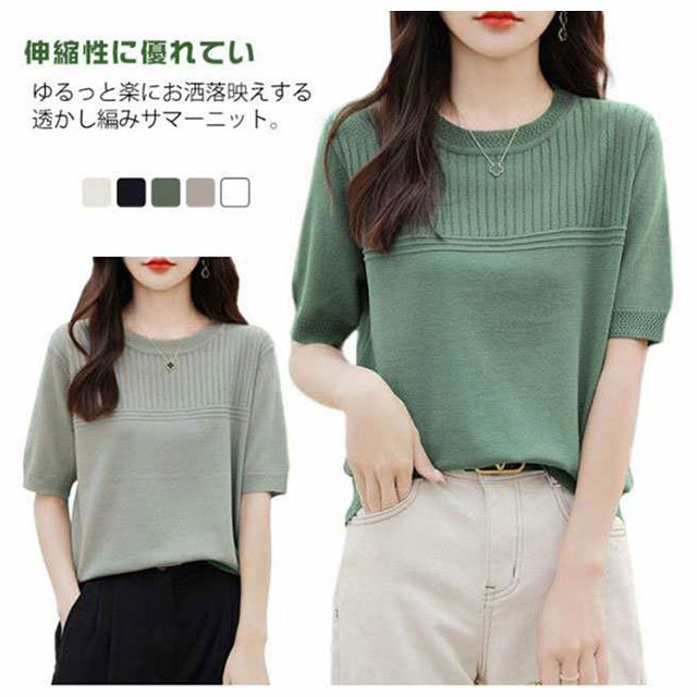 サマーニット 夏ニット メッシュニット レディース 春 夏 トップス 半袖 五分袖 プルオーバー ナチュラル 透かし編み 切替 セーター クルーネック ゆったり 体型カバー 大人 お洒落 薄手 細見え ストレッチ オフィスカジュアル