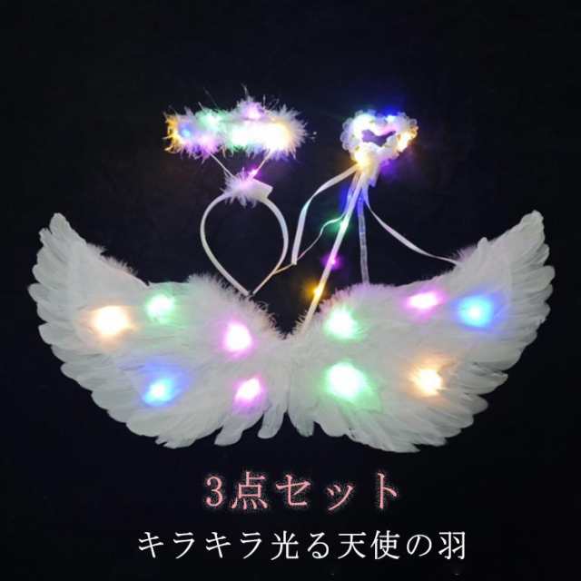 3点セット キラキラ光る天使の羽 コスプレ衣装 ハロウィン カチューシャ ステッキ ベビー コスプレ用 エンジェル 子供用 仮装 天使の羽 かわいい 翼 3点セット 羽根 LEDライト付き コスチューム フェザー ウィング イベント パーティー 妖精