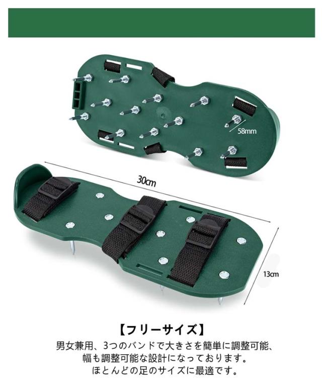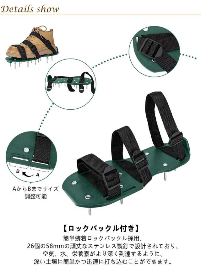 | 芝生を健全な状態に維持! 裝着簡単! 芝スパイク 【 ガーデンスパイク】履いて歩くだけ芝生の穴あけ作業が簡単に芝生のお手入れに重要な穴あけ作業。複雑な機器や多額の費用に投資する必要はありません。ガーデンスパイク履い芝生の上を体重をかけながらゆっくり歩くだけ。足の裏のスパイクで穴あけが簡単にできます。歩くだけで穴あけ作業ができるので、とっても簡単。面倒な芝生のメンテナンスラクラクになります。 【効果】土に穴をあけ空気を送り、土壌微生物を活性化 、土の軟化 、保水性や通気性の向上 ・芝生を適度に傷めて成長を活性化し、発根促進 ・古い根を切る 芝生を綺麗に保つ事ができます。 【ロックバックル付き】簡単装着ロックバックル採用、26個の58mmの頑丈なステンレス製釘で設計されており、空気、水、栄養素がより深く到達するように、深い土壌に簡単かつ迅速に打ち込むことができます。通気性のある健康的な芝生を手に入れることはかつてないほど容易になります。 【フリーサイズ】男女兼用、3つのバンドで大きさを簡単に調整可能、幅も調整可能な設計になっております。ほとんどの足のサイズに最適です。 【組み立てが簡単】専用工具が付いているので、取り付けが非常に簡単で、靴のスパイクを固定するだけで完成。 使用手順: 1.釘を取り付けます。 2.バンドを取り付けます。 3.本製品を靴に付けます。 4.完成後 | |