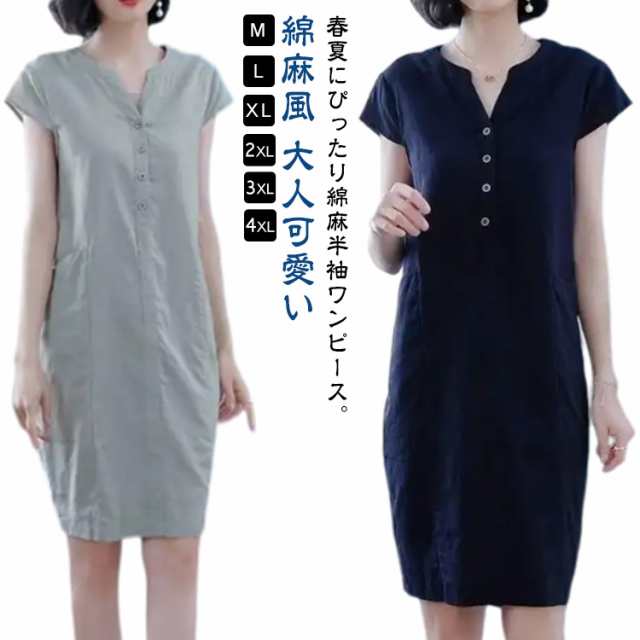 春 ワンピース ワンピース 40代 レディース 綿麻ワンピ 綿 リネン風 体型カバー きれいめ 綿麻風 半袖 リネン風ワンピース 大きいサイズ 綿麻 ミモレ丈 Vネック 夏 エレガント 送料無料 ゆるっと 大人可愛い 30代 M-4XL!Tシャツワンピース
