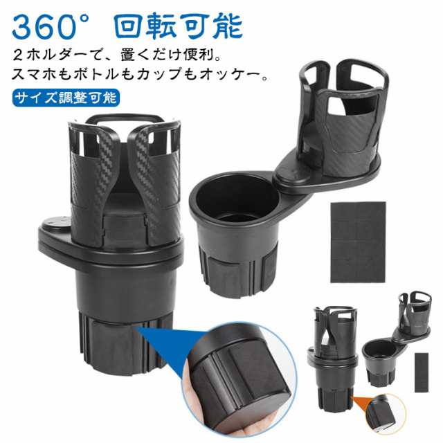 | 2ホルダーで、置くだけ便利。 スマホもボトルもカップもオッケー。 360°回転可能 サイズ調整可能 ・POINT.1 「すっきり収納、快適ドライブ」 ・2ホルダー&360度回転のマルチで便利なドリンクホルダー。 上部のアームは伸縮式で、ドリンク、カップはもちのロン、 スマホにカードにキーケース、タブレットまで置けるので、 ちらばる小物もスッキリ収納。スマートドライブ必需品です。 ・POINT.2 「2ホルダーで、マルチに固定」 ・便利でお得な2ホルダー。 可変式の上部カップホルダーは、なんでもマルチにしっかり固定。 360度回転式で、ドリンク、スマホをお好きな位置に簡単移動。 つかう前には戻れない。簡単・便利なドリンクホルダーです。 ・POINT.3 「置くだけ簡単、全車種対応」 ・既設のドリンクホルダーに置くだけの簡単設置。 ・付属のクッションが増設カップホルダー特有の振動を減らすので、 ドリンクを置いた際のカタカタ音を軽減することも出来ます。 ・POINT.4 「長持ち」 ・素材には耐熱性&耐衝撃性に優れたABS樹脂を採用。 ・長持ち・で、ながい間お使い頂くことが可能です。 ・POINT.5 「見た目もシックに。カーボンブラック」 ・本体カラーには高級感あるカーボンファイバーブラックを採用。 違和感なく車内に持ち込め、且つ、室内をスタイリッシュに演出してくれます。 車内をいつでも快適に。 つかって納得。お洒落で便利な、ダブルドリンクマルチカップホルダーです。 | |