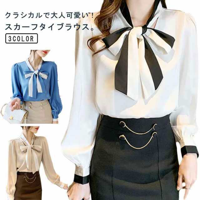 トップス ホワイト リボン ボウタイネック シャツ スーツ ブラウス 春 ブラウス フォーマル インナー バイカラーボウタイブラウス シフォン おしゃれ ボウタイブラウス レディース 大人可愛い シャツ 秋 長そで 配色 上品 きれいめ ブルー 長袖