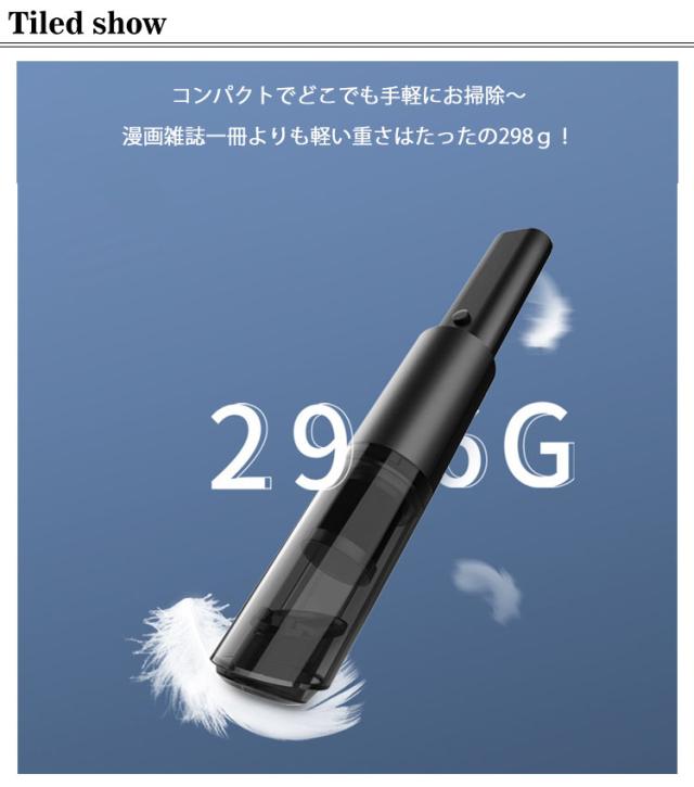 | 充電式車載掃除機! コードレスで手に取りやすい? コンパクトでどこでも手軽にお掃除?漫画雑誌一冊よりも軽い重さはたったの298g! 車用だけでなく家にもオフィスにも使える? 圧倒的な吸引力?6000pa強吸引力で様々なごみを一瞬で吸い取り、快適な環境を作り出せます。 | |