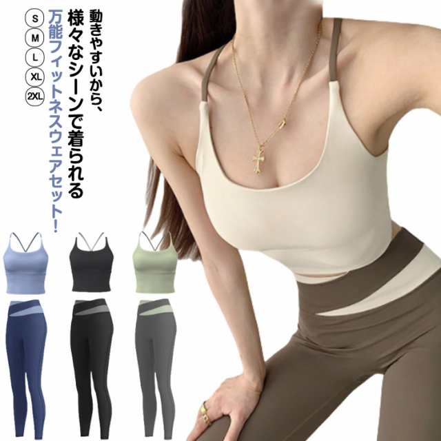 薄手 上下セット 無地 ストレッチ レギンス ヨガトップス パッド一体型 レディース ブラトップ 速乾性 バイカラー ヨガウェア 2点セットアップ クロップド丈 バッククロス ハイウエスト 美脚 着?せ 運動着 ホットヨガ
