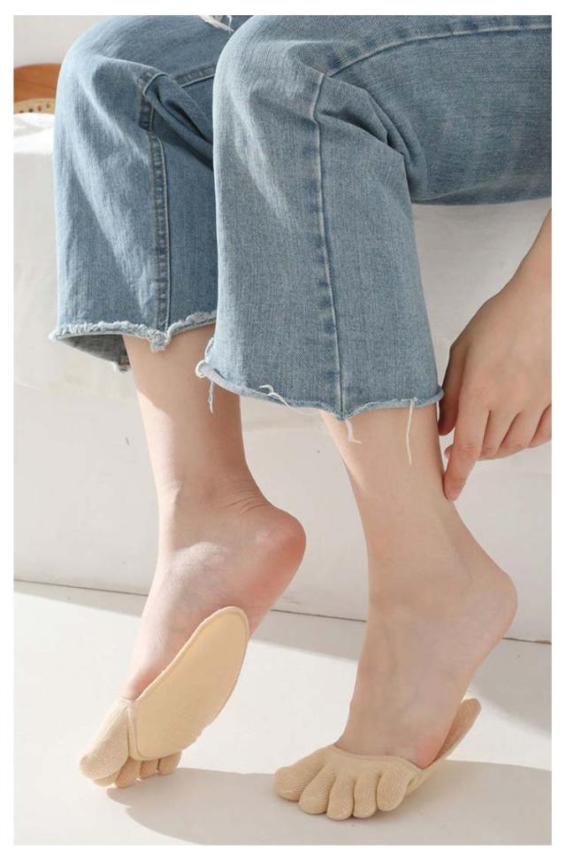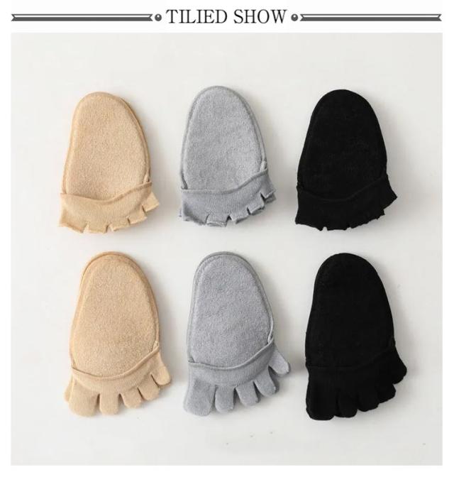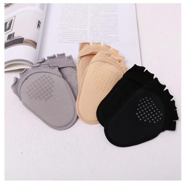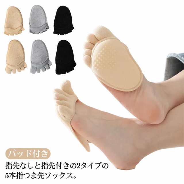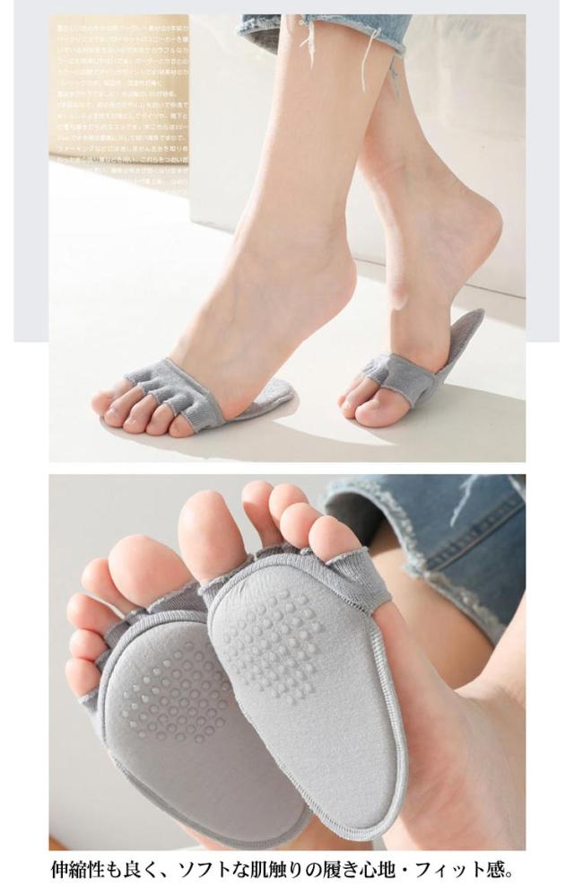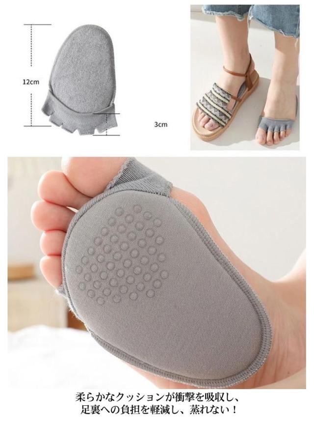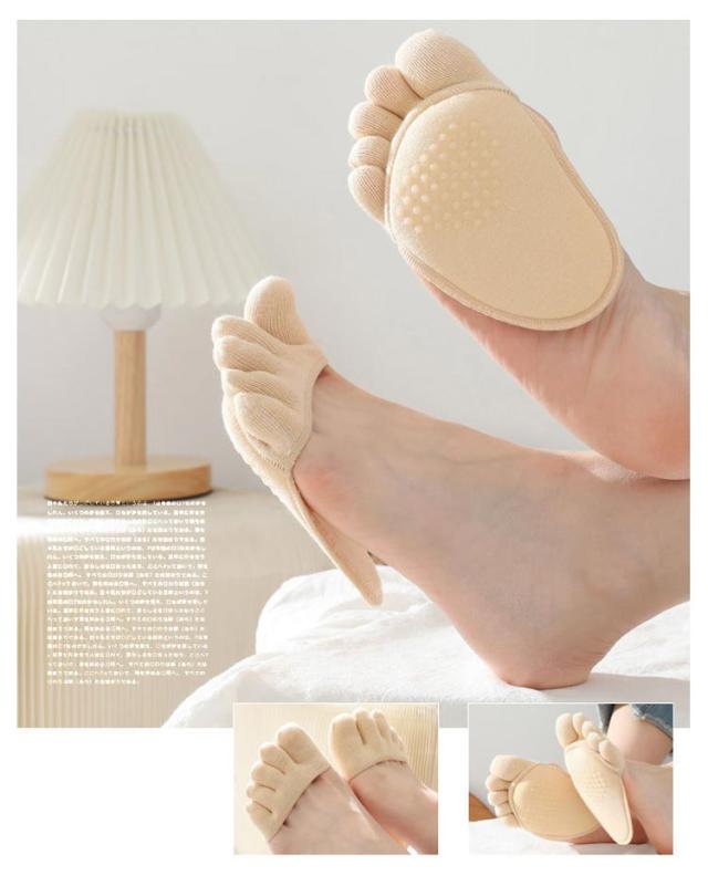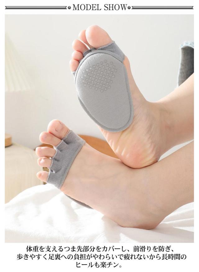 | 指先なしと指先付きの2タイプの5本指つま先ソックス。パッド付き! 体重を支えるつま先部分をカバーし、前滑りを防ぎ、歩きやすく足裏への負担がやわらいで疲れないから長時間のヒールも楽チン。 伸縮性も良く、ソフトな肌触りの履き心地・フィット感。 柔らかなクッションが衝撃を吸収し、足裏への負担を軽減し、蒸れない! 指先なしタイプのはサンダル、ミュールやオープントゥパンプスなどシューズにオススメ。 20代の若い女の子から、30代、40代の大人女子まで、年齢を問わず、幅広い方々にご愛用いただけます。 | |