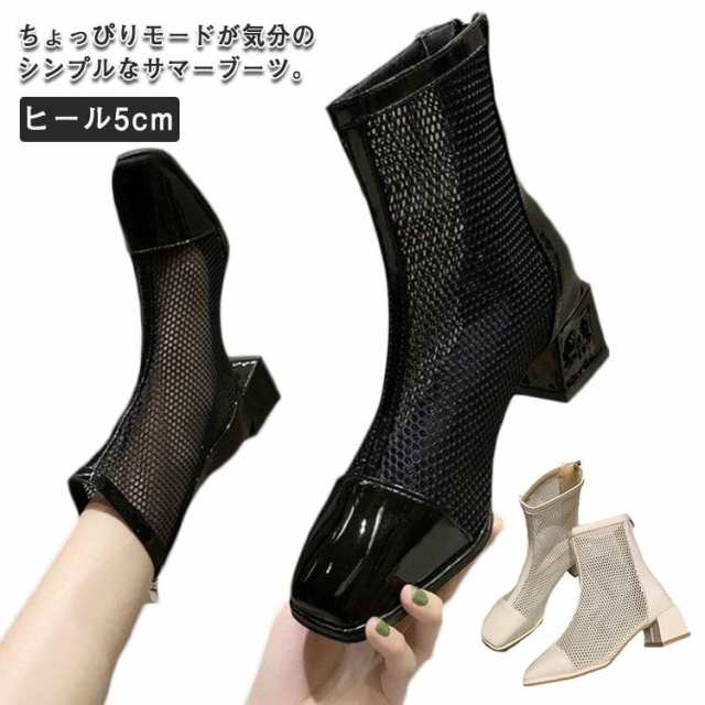 ブーツ レディース メッシュ サマーブーツ 透け ショートブーツ スクエアトゥ チュールブーツ 夏 美脚 ブーツサンダル 通気 バックジップ ヒール5cm 太ヒール 大きいサイズ 歩きやすい 痛くない
