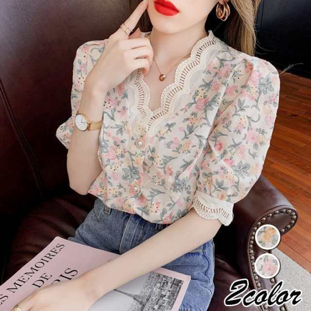 ブラウス レディース 40代 春夏 オシャレブラウス レース花柄 Vネックブラウス パフスリーブブラウス 五分袖 トップス おしゃれ 上品 通勤OL ゆったり 30代