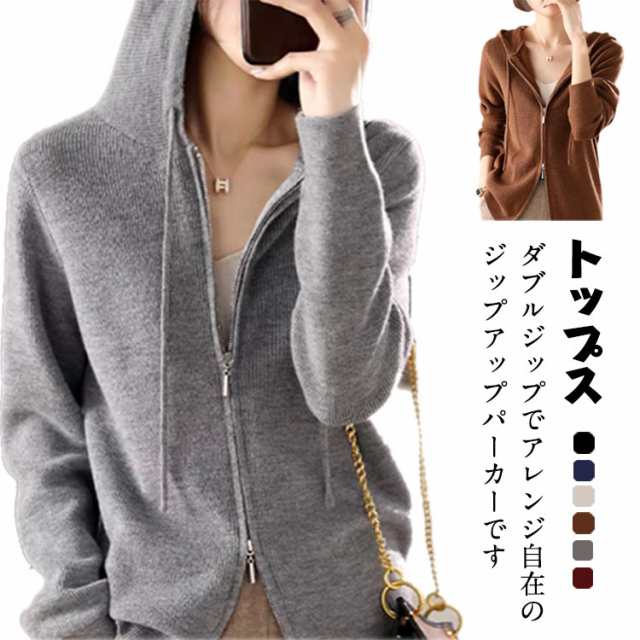 ダブルファスナー ニットパーカー 送料無料 レディース フード付き パーカー ニット ダブルジッパー カーディガン ジップアップ トップス レイヤード 両開き 春 秋