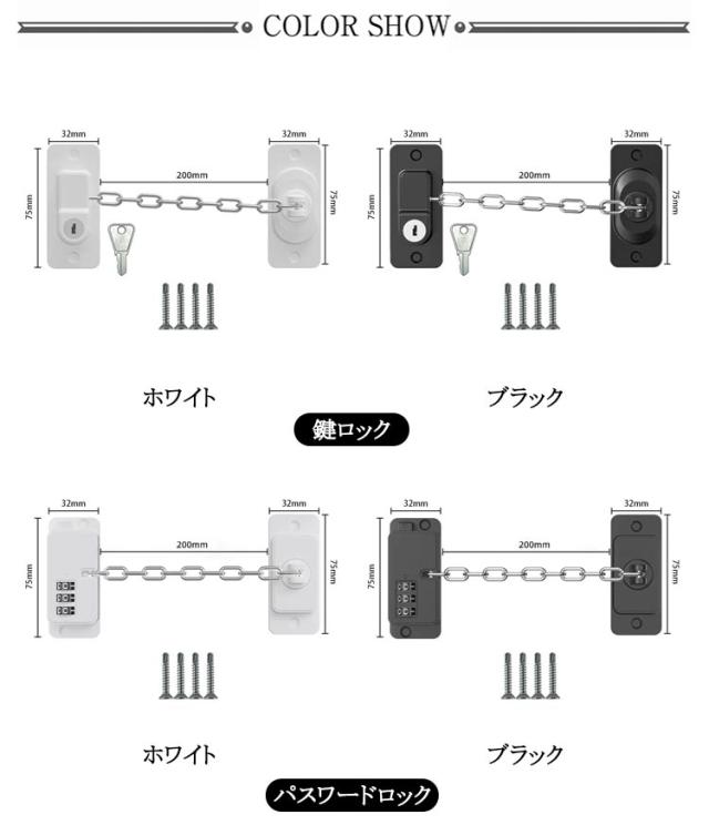 | 鍵とパスワードの2タイプ選べる! 窓や引き戸の補助用鍵、ロック。 防犯用にも最適ですが、隙間風を入れながらロック出来るのも強み。 暑い時に隙間を開けると心配。そんな時にこれで鍵が掛けれます。 お子様の安全にもペットの脱走防止にも。 ドア、窓、キャビネット、冷蔵庫、飲料水機すべて使用可能です。 | |