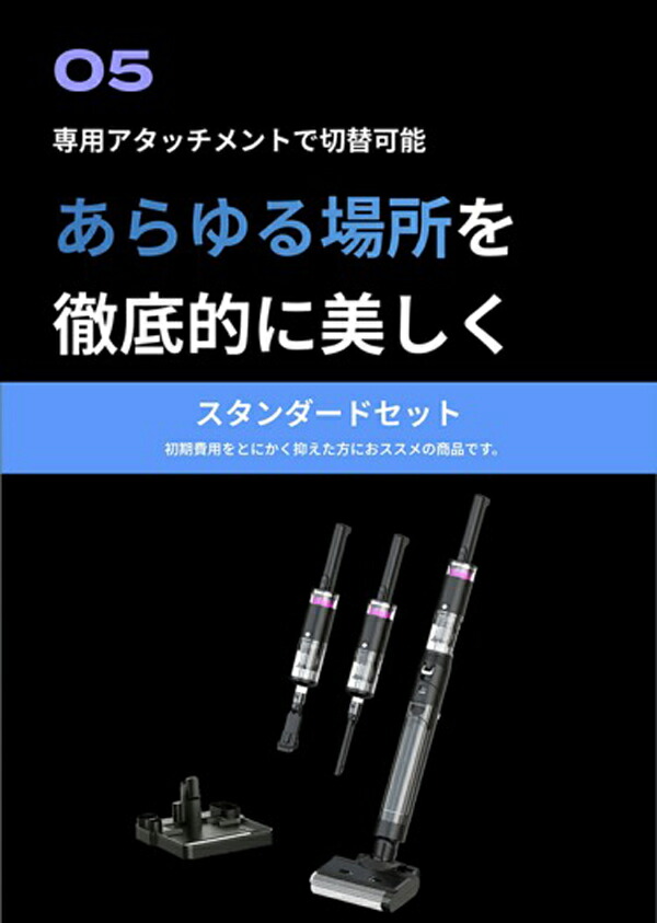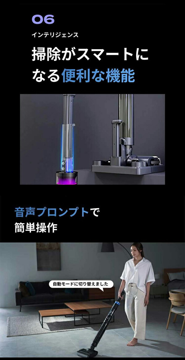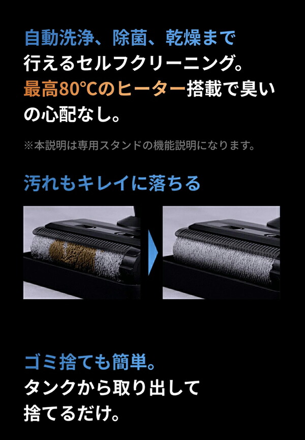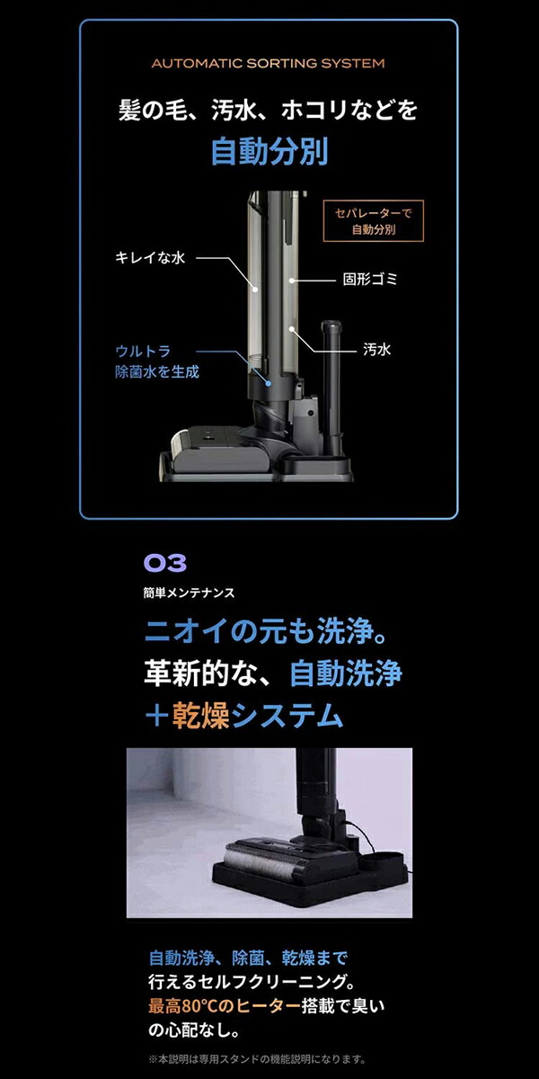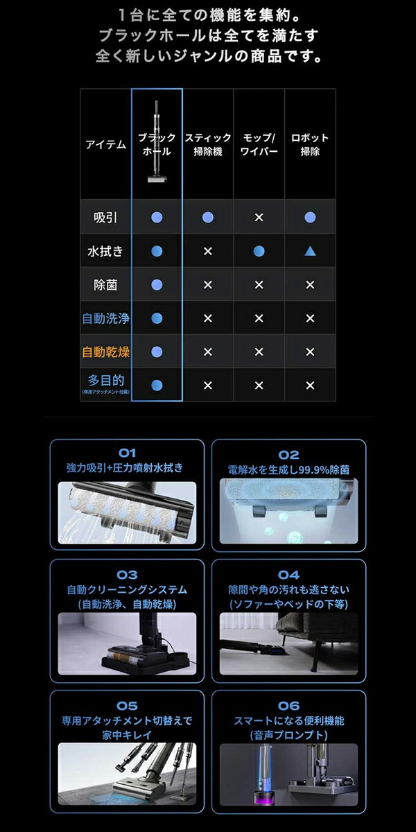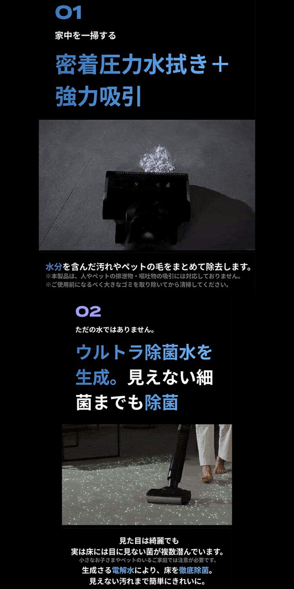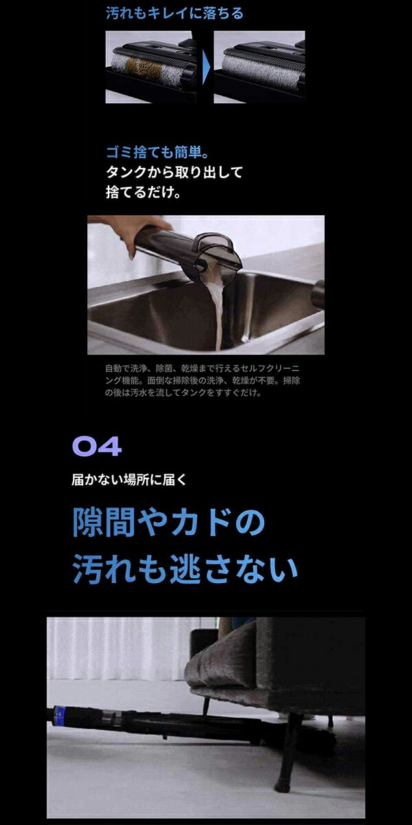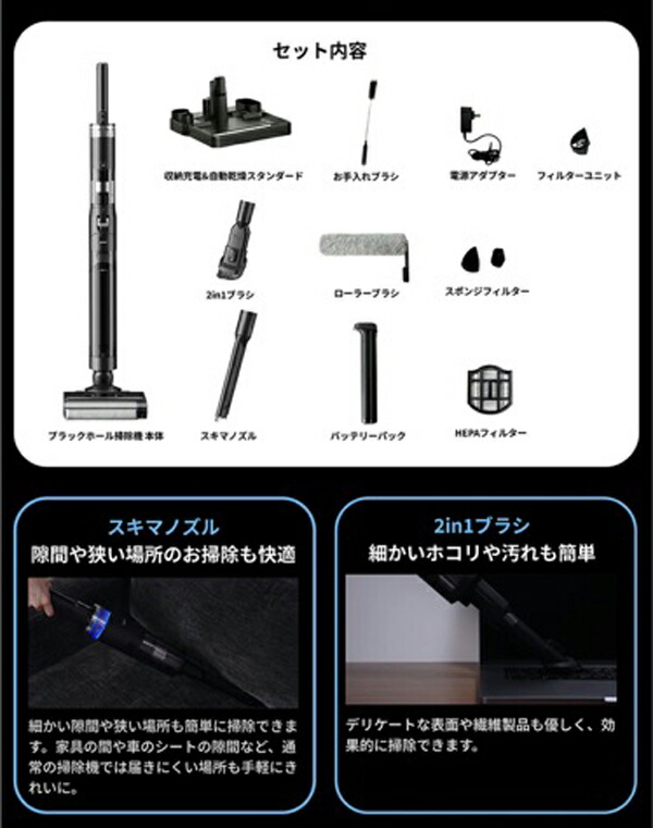 【これ1つで家中を一掃】 ・これ1台で掃除、除菌、乾燥が可能!強力吸引と自動洗浄機能を備えた ブラックホール掃除機。 ・目に見えない汚れや菌まで徹底除去!除菌水生成機能で清潔なお部屋を実現。 ・80℃ヒーターで自動乾燥し、掃除後の手間を大幅カット! 【3つの機能で家中を一掃】 ・1強力吸引と密着圧力水拭き。 ・汚れを浮かせながら強力に吸引する密着圧力水拭き機能で、床の目に見えない 汚れまで一気に除去。 ・食べこぼし、ペットの毛、大きなゴミ、こびりついた汚れまでしっかりキャッチ。 ・ヘッドに絡まる髪の毛も内部のクシ構造でスムーズに除去。 2自動生成される除菌水で除菌 ウルトラ除菌水生成機能を搭載。見た目は綺麗でも目に見えない菌までしっかり除去。 ・特に小さなお子様やペットのいるご家庭で安心。 ・除菌水で水拭きし、清潔な環境を保ちます。 3自動洗浄&乾燥機能 ・掃除後のブラシや水拭きパッドを自動洗浄、さらに80℃のヒーターで自動乾燥します。 ・セルフクリーニング機能で手間なく清潔に。 ・臭いの発生を抑え、いつでも快適な掃除環境をキープ。 |