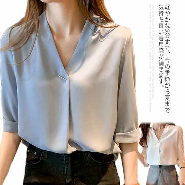 ブラウス レディース シャツ 五分袖 半袖 シャツブラウス トップス 体型カバー Vネック フォーマル スーツインナー ビジネス ナチュラル 無地 きれいめ オフィス 女性用 通勤 ビジネス オフィス フォーマル 着痩せ 入学式 卒業式 就活 面接 通勤 春夏 送料無料