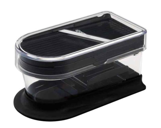 【便利な機能をコンパクトにひとまとめ】大型ラバーすべり止め付き。セラミック刃だから「軽く、素早く、キレイに切れる」スライサー。薄切り・せん切り・おろしプレート・プロテクター・受け容器をコンパクトに収納
