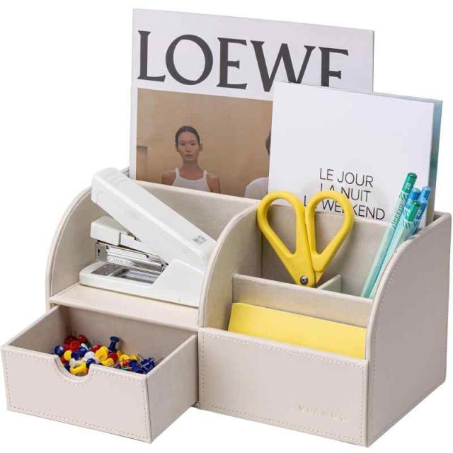 【小さいサイズと大容量】サイズ28.1*14.2*14.2cm 重さ0.82kg 。5つのコンパートメントと引き出しがあり、約ペン/鉛筆30本、雑誌2冊を入れることができ、一つだけでデスクを綺麗にします。