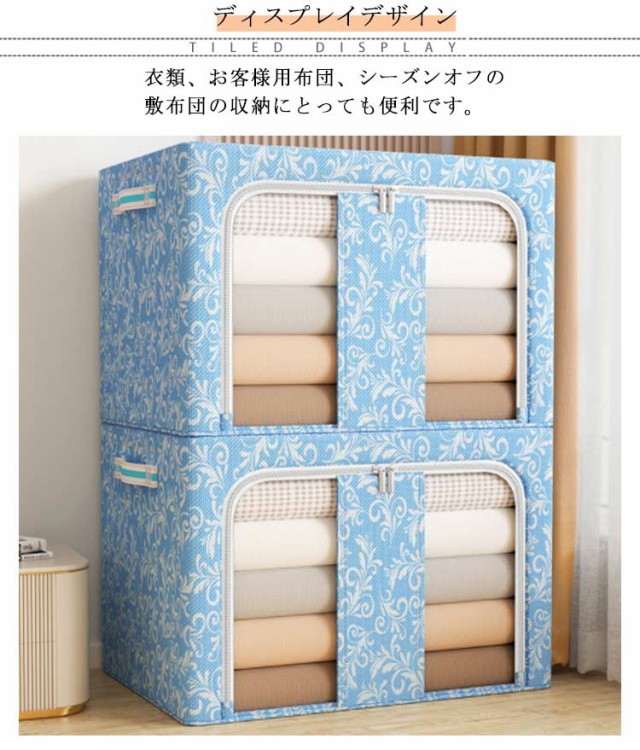 | 【商品名】布団収納ケース 【サイズ】 100L(60*42*40cm) 【素材】オックスフォード布、メタルワイヤー 【特徴】 透明窓付き布団収納袋のご紹介です。 ほこり・湿気から守る! 衣類、お客様用布団、シーズンオフの敷布団の収納にとっても便利です。 メタルワイヤーで自立するのでとっても便利です。 積み重ねて使用できるので、収納場所も無駄なく使うことができます。 上から、前から2方向取り出しも楽ちん♪ ダブルファスナー式ですので中身の出し入れが簡単です。 持ち手がついているので、持ち運びに便利。 使わないときはコンパクトに折りたためるので、わずかな隙間に収納可能。 北欧風はもちろん、和モダン、カフェ風、洋室、和室にも似合うオシャレな収納ボックス。 | |
